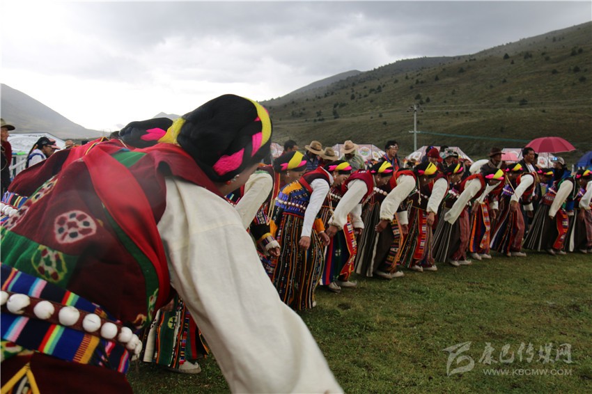 10月2日,在木雅鍋莊悠揚(yáng)的旋律和輕盈的舞步中,歷時(shí)兩天的“2017康定情歌國(guó)際音樂節(jié)”盛大開幕,作為“五大民俗展演”中的特色民俗歌舞表演部分,木雅鍋莊吸引了眾多游客的關(guān)注。木雅鍋莊來源于木雅人的日常生產(chǎn)和生活,是當(dāng)?shù)剞r(nóng)耕文化習(xí)俗的重要表現(xiàn),表演服飾多以棕紅色外套,紅、白色襯衫為主,表演者多佩戴紅頭繩、珊瑚、金銀等裝飾物。舞蹈分男女兩組,列隊(duì)圍桌成圓形,皆彎腰垂首隨領(lǐng)唱歌聲而舞。男組舞姿氣勢(shì)豪放,女組舞姿委婉優(yōu)雅。唱腔宛轉(zhuǎn)悠揚(yáng),吸引了在場(chǎng)觀眾冒雨駐足觀看,有的甚至情不自禁隨著舞群踏起了舞步,融入到康巴文化的神秘魅力當(dāng)中。