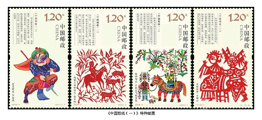 2018年1月24日,中國郵政發(fā)行《中國剪紙(第一組)》特種郵票,全套4枚。這是中國郵政繼1959年1月1日發(fā)行的《剪紙》特種郵票59年后重新發(fā)行的《中國剪紙》系列郵票。全系列郵票計劃發(fā)行4組,每組4枚。這次發(fā)行的第一組4枚郵票入選內(nèi)容分別是被列入第一批國家級非物質(zhì)文化遺產(chǎn)名錄的北方四處剪紙傳承人的作品:第一枚“河北蔚縣·蘆花蕩”,河北蔚縣剪紙歷史悠久,風格獨特,題材多取自于人物,造型設計疏密有致,點染絢麗鮮艷。此幅作品作者王老賞(1890-1951),河北省蔚縣南張莊村人;第二枚“內(nèi)蒙和林格爾·牧羊圖”,內(nèi)蒙古和林格爾剪紙多反映游牧生活,具有古拙浪漫、質(zhì)樸奔放、熱情率真的藝術風格。此幅作品作者張花女 (1903-2004),和林格爾縣董家營鄉(xiāng)曹老八夭村人;第三枚“陜西旬邑·江娃拉馬梅香騎”,陜西旬邑的彩色剪紙具有民間美術的鮮活靈動,無拘無束,形象稚拙而又鮮明,構(gòu)圖緊密完滿而又單純明快,色彩對比強烈而又協(xié)調(diào)適度。此幅作品作者庫淑蘭(1920-2004),陜西咸陽市旬邑縣張洪鎮(zhèn)赤道鄉(xiāng)富村人;第四枚“山西新絳·小別母”,山西新絳剪紙藝術源遠流長,內(nèi)容豐富多彩,尤以人物見長,戲曲題材作品更為突出,構(gòu)圖簡潔飽滿、精煉極致,粗獷中見典雅,簡煉而不簡單。此幅作品作者蘇蘭花(1906-1995),山西運城市新絳縣澤掌鎮(zhèn)北蘇村人。
