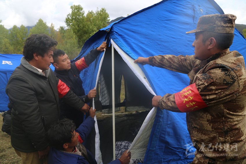 應急救援人員在安置點搭建帳篷。