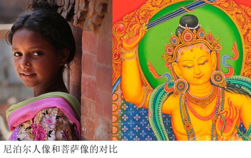 特別值得注意的是:之前佛教藝術(shù)的帕拉風(fēng)格繪畫中的臉型普遍是方正偏長(zhǎng)的,而在尼瓦爾唐卡里,臉型普遍是方正偏短。偏短的方臉會(huì)讓五官顯得更加集中一點(diǎn),特別是眉額比較大、眼睛位置下移,這樣的感覺有點(diǎn)近似于嬰兒的面部比例。而眉骨、鼻骨高挺,又不似兒童,這樣的面部特征其實(shí)和尼國(guó)人的長(zhǎng)相比較接近。也許是尼瓦爾人善于觀察、擅長(zhǎng)描摹的天分,逐漸把本民族沉靜的性格與容貌,潛移默化地滲透進(jìn)了唐卡,產(chǎn)生了新的風(fēng)貌。