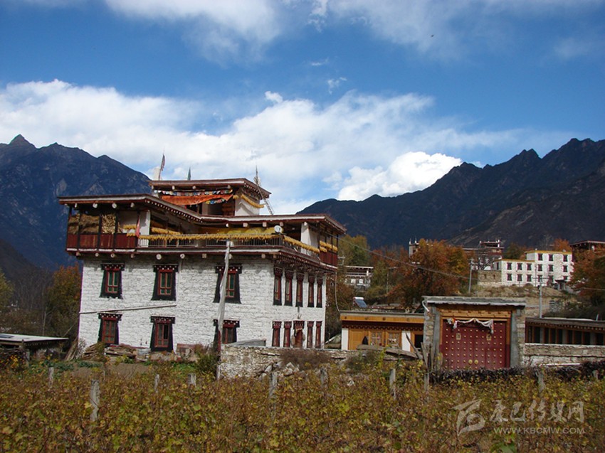 當(dāng)翻過(guò)一處斷崖,眼前豁然開(kāi)朗。一大片平整的田地出現(xiàn)在我們的面前。田地里,一棟棟白色的藏房或鶴立雞群,或三五聚集,看似毫無(wú)規(guī)律,其實(shí)從整個(gè)房屋大門的朝向可以看出,在房基的選擇時(shí),對(duì)陽(yáng)光的接納面、風(fēng)水等都作了充分的考慮。