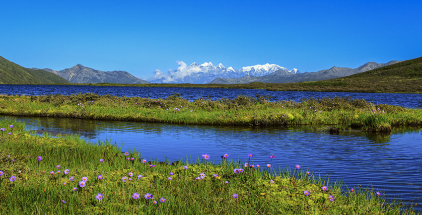 在山谷中穿行十余公里,路面一點(diǎn)點(diǎn)抬起,上了貢嘎山脈,徑直進(jìn)入康定情歌景區(qū)。隨著海拔的升高,涼意漸濃。山依舊是主角,地勢卻變得平緩而開闊,有茵茵的草地,有大小湖泊,沿途山泉潺潺,野花點(diǎn)綴,空氣清幽,方才單調(diào)的褐色很快被淡忘。山體漸次出現(xiàn)密集而低矮的灌木,枝條筆直地立著,有高寒山區(qū)的凜然之氣。灌木一層層上延,樹木雜多,大片的原始森林漫過山體,將大山包裹起來。遠(yuǎn)處,藍(lán)天白云之下,貢嘎雪山在群峰中探出頭來,擦亮高空的陽光。澄明的空氣里,仿佛可以聽見雪??┛┑匦Αx那間,仿佛所有的大山,都開始舒展筋骨。