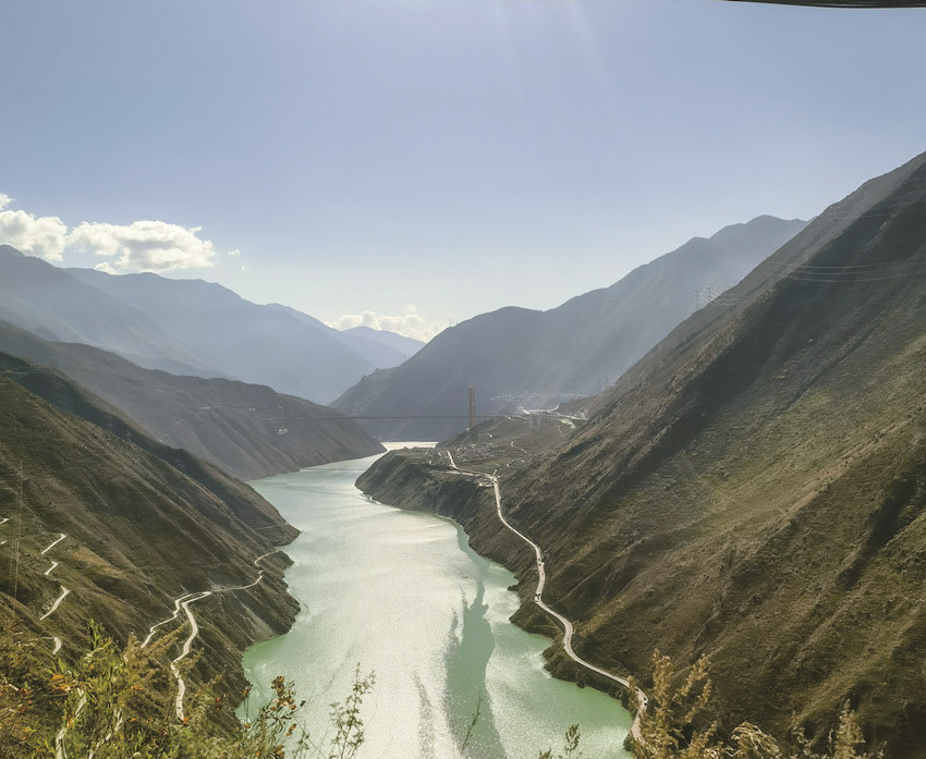上嵐安的盤山路,在不停的彎折,每一個折又將路往上抬升一些,看著離大渡河越來越遠,應該離嵐安近了。汽車在這條并不寬的路上行使,車窗外掠過的景色讓人有些意外。從來沒有從這個角度看過大渡河和沿河的景色,耀眼的陽光下,嵐安大橋橫跨大渡河,不遠的地方是一個小村子,河水靜靜的流淌,平靜的河面如緞面般光滑。順著河流的方向,更遠的地方就是雅康高速上的大渡河大橋,紅色的大橋在周圍藍的、綠的、灰的、白的顏色之中,很搶眼。這時,我們走過的路,也在身后像一條細細的白色帶子繞在山坡上。路旁高高的野草隨風而動,黃色的莖須像極了豐收時的青稞。因為是第一次來,每一眼看見的都是新鮮,上山的路,也就沒有想象中艱難。不過,聽說這條還算平坦的水泥路是新修的,之前的土路,又窄又陡,遇到會車都是很困難的。