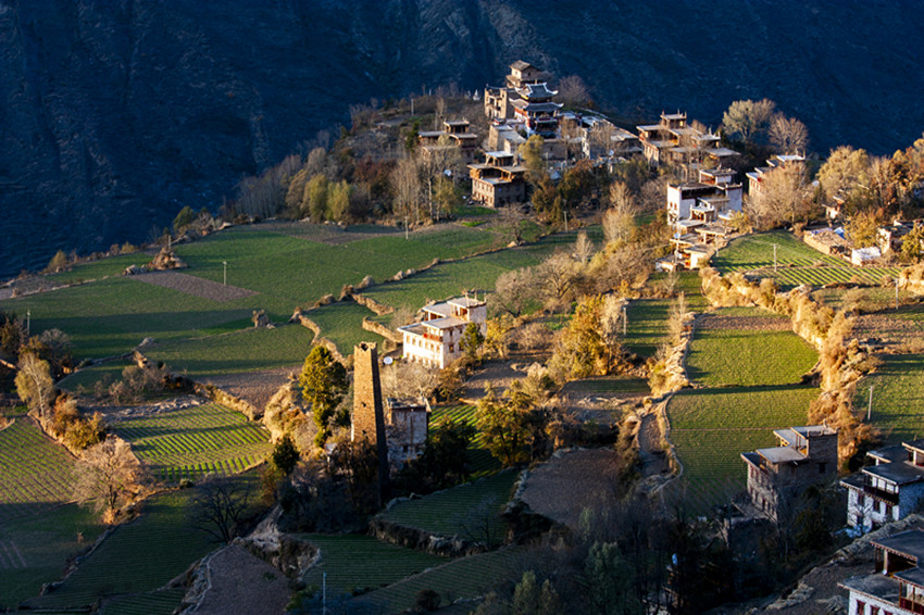 丹巴,無論在深山峽溝,還是在田間林園,藏房路口隨處可見高大的古碉以及殘垣斷墻的碉址遺跡,這一切蘊(yùn)含著多么大的勞動量。殘酷的年代,先民們赤腳背石,手抓繩索,一石一泥,一檁一椽,日復(fù)一日,年復(fù)一年,一點(diǎn)點(diǎn)背上去,一寸寸砌起來。這樣可敬的古碉,它的每一個角、每一塊石頭、每一鏟泥巴,都是先民們用汗水所鑄,同時也寫下了藏民建筑史上光輝的歷史。