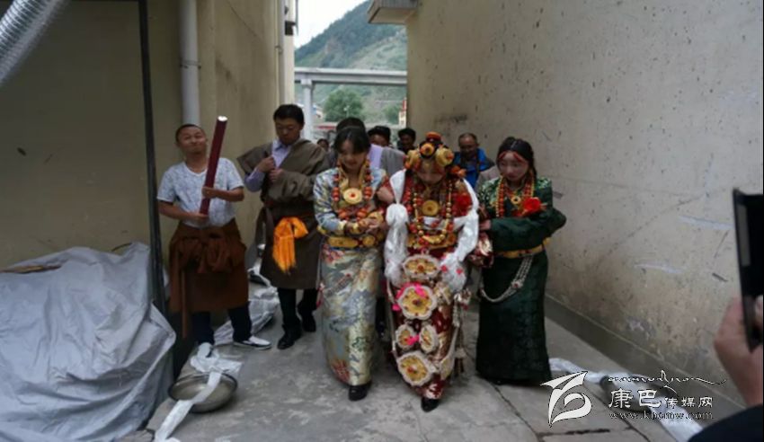 接親。除表現(xiàn)主人的熱情、好客、大方外,還要講究氣派,顯富有、高檔次、高規(guī)格。以娶親為例,舉行婚禮的當天,男方要組織數(shù)十匹馬隊或高檔汽車接親,披金掛銀,蔟新華麗。接親的馬隊從新娘家出發(fā)后,男方要在家或路過人家必經(jīng)之地設置吉祥物,如盛滿一桶水或鋪一床藏毯、或隨身衣物鋪在地上,當接送新娘的馬隊路過時,接親的人要給吉祥物獻哈達和拋撒銀錢、紙錢和糖果等以示新娘路遇彩頭、沖喜,表示吉祥如意。到男方家后新娘被扶下馬或扶下車,高僧大德頌吉祥詞后,圍繞所放佛像或吉祥八寶圖及裝滿水或牛奶的銅鍋順轉(zhuǎn)三圈后,踩著從大門口鋪至經(jīng)堂的藏毯進屋,進入客廳之前新娘只身先進廚房,點燃灶里準備好的柏香紅木或枝葉進行熏煙,據(jù)藏醫(yī)考證熏香煙對身心健康有益,也可表示從即日起新娘便是男家的主婦了。