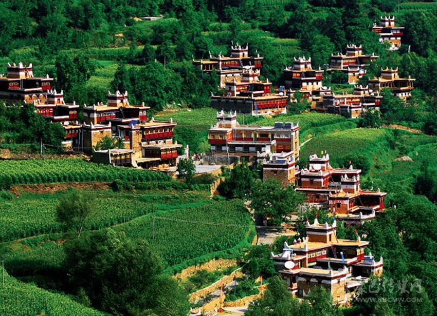 藏式房多平頂,可以說是環(huán)境的產(chǎn)物。高原干旱少雨,無須飛檐高頂,冬有積雪,便于打掃;最重要的是風(fēng)沙大而頻繁,高屋難耐勁風(fēng)。此外,平頂民房還有一個(gè)精神功能就是作為信仰的場所。房頂供奉有神靈的祭壇,有煨桑的香爐,更有家家必插的五色經(jīng)幡,有的房頂平臺(tái)的圖符裝飾極為精美,把最古老的建筑樣式和最現(xiàn)代的建筑格調(diào)融為一體。另一個(gè)共同特點(diǎn)便是,一般講究一些的農(nóng)村都把房子的夯土外壁刷成暗含深意的純白。這自然是典型的藏式院落了。而不太講究的半農(nóng)半牧區(qū)則保持原色。白色房屋上部突出棕色材料的房檐,或漆成棕紅的裝飾帶,既勾勒出輪廓,又平添了幾多美觀。白色建筑在藏語中有個(gè)非常詩意的名字,叫“點(diǎn)點(diǎn)繁星”。