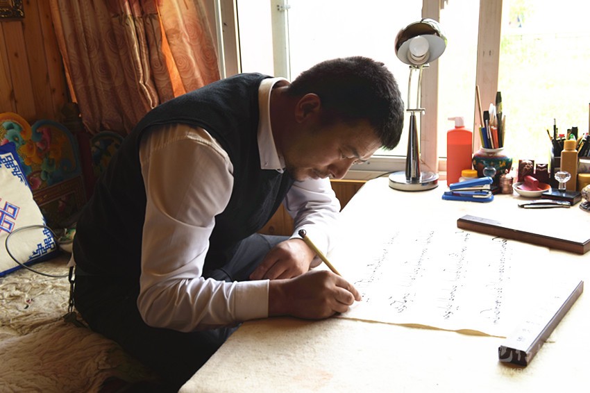 他引用一句諺語來表達:“水那邊的干牛糞沒撿到,水這邊的濕牛糞也沒有見撿到。” 在昂旺曲批看來,靜心是藏文化非常重要的精神傳統(tǒng),這也是藏文書法和唐卡立身的根基。而昂旺曲批記住這句諺語,無非是隨時提醒和勉勵自己。