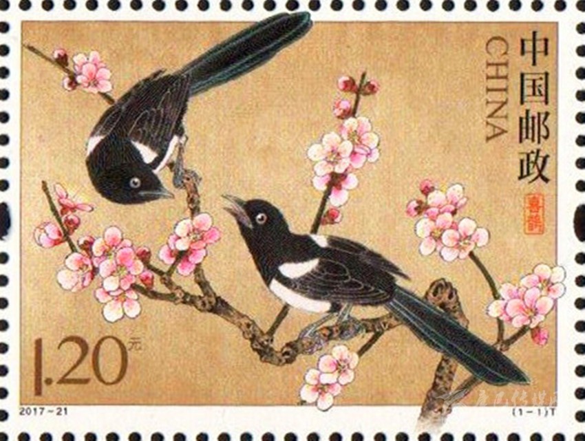 中國郵政定于2017年8月28日發(fā)行的《喜鵲》特種郵票。