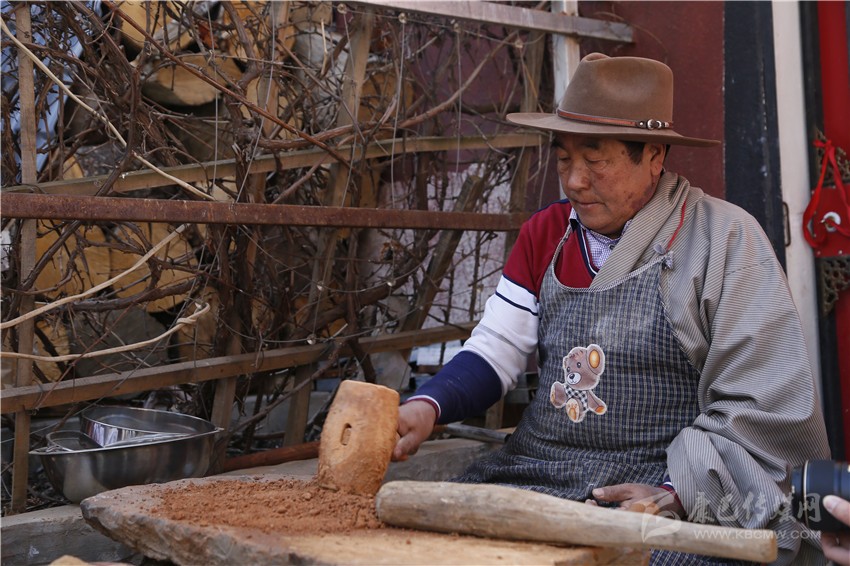 清晨,大師背起背簍和鋤頭來到海拔4000米以上的山上挖泥,挖泥前要舉行簡(jiǎn)單的祭祀儀式,用脫水的松柏枝和酥油糌粑混合燃燒。裊裊清香彌漫在山間,這時(shí)大師用鋤頭挖著制作藥泥面具的泥土,泥土分為紅色雌泥和白色雄泥,雌雄兩種泥土結(jié)合后具有一定的硬度,以此制作的面具不會(huì)出現(xiàn)裂開的情況,同時(shí)保證配方藥不變質(zhì)。