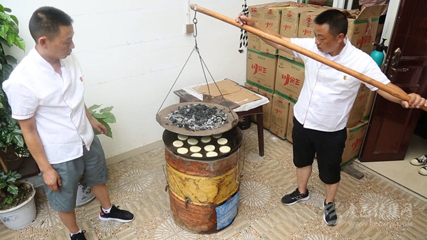 用酥皮包裹好餡料,放入模具內(nèi)壓緊壓實。點心脫模后在點上屬于“周聾子點心”的獨家標(biāo)記(四瓣花),便可進入烤制流程,烤爐分為上鏊與下鏊。首先將吊爐上下火都提前預(yù)熱至250°左右,然后把制作好的點心正面朝下放在吊爐里,最后將上鏊移入吊爐上方,進行點心的烤制。根據(jù)經(jīng)驗確定烤制時間,當(dāng)?shù)鯛t里飄出香味后,即可將上鏊挪離吊爐。點心背面呈現(xiàn)出“偷油婆色”(焦黃色)后,迅速將點心翻面,繼續(xù)烤制成褐色,出爐即可食用。