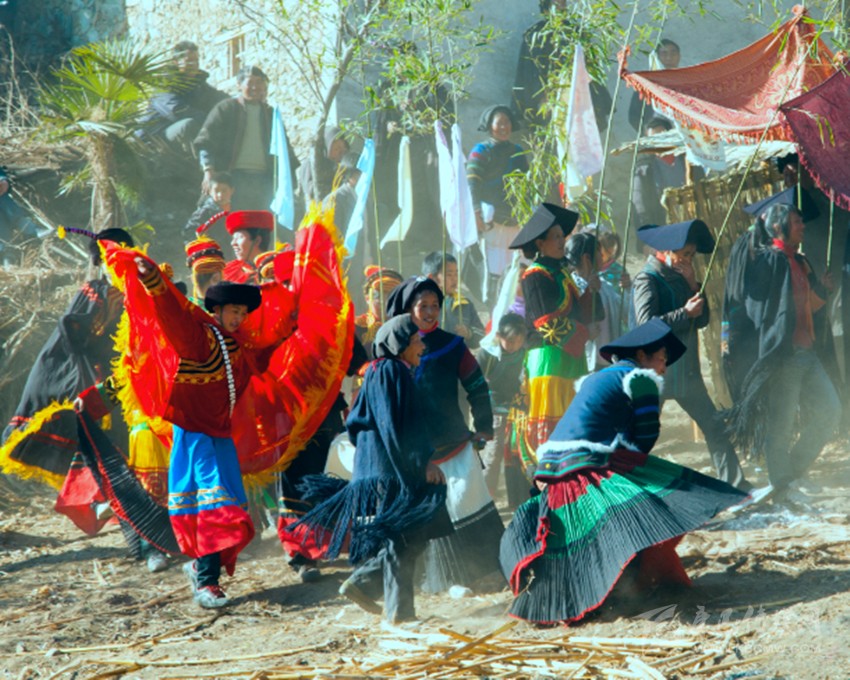 我?guī)е纸o我準(zhǔn)備的迎親酒向李木坪走去。我激動(dòng)、欣慰,然而也深感惶恐不安。激動(dòng)欣慰的是我就要看到我日夜思念的新娘了,惶恐不安的是我怕被新娘的“近衛(wèi)軍”們捉住,罰酒背新娘。護(hù)送新娘到男方家完婚的全都是清一色的男性,有新娘的長輩、哥哥、弟弟、表兄弟等等。按彝家的風(fēng)俗,新郎如果在戒備森嚴(yán)中摸到新娘,就讓“近衛(wèi)軍”們乖乖地把新娘背到新郎家里;如果摸不到,不僅新郎被罰酒,而且新郎還得老老實(shí)實(shí)把新娘背到家里。罰酒、背新娘倒不在乎,就怕站在遠(yuǎn)處看熱鬧的小伙和姑娘們奚落一通,說摸不到新娘是沒本事的新郎。