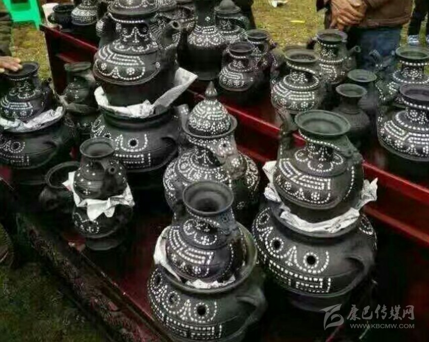 宗教佛事用陶具的制作和用途有明確規(guī)定,當?shù)匕傩赵诿磕瓴貧v新年前夕均要制作佛事用具。以戶為單位,每戶3件,其明顯特點是顏色都有別于黑陶,多采用白色作陪襯。制作好的佛事陶具于藏歷新年初五送往寺廟,由寺廟高僧做法事,擇日,在太陽出來前將陶具置于河中深水處,祈禱來年風調(diào)雨順、人們幸福安康。
