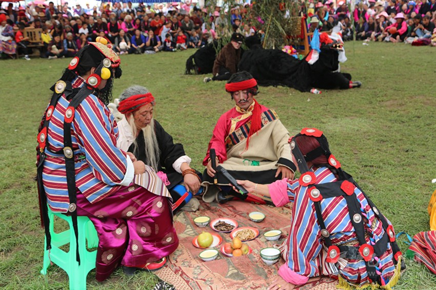 無論是小時候還是現(xiàn)在,“央勒節(jié)”都是我們期盼的節(jié)日,看不懂藏戲,但必須去湊鬧熱,否則這一年就有缺憾。父親作為家中老大,節(jié)前一個月會組織他的兄弟姐妹們開個家庭會議,商議湊錢、做飯、家什等各種細小瑣事,然后派出家族中幾個壯勞力去“龍王塘”約定束成的地盤上拔草、平地、做記號,表明“德嘎”家族今年還要在這個地方搭帳篷,其他人家看到記號,不會再來占地盤。節(jié)日前一天,稱為“亞堆”,不管有多麻煩,都要在這一天把家搬下去,晚上守帳篷的通常是堂姐夫,做飯洗碗則是我們姐妹們的任務(wù)。“龍王塘”有兩眼溫泉,由于水質(zhì)的原因,酥油茶和冒面與自來水做出來的不是一個味兒,非常清香。特別喜歡“央勒節(jié)”之夜,它是一首詠嘆調(diào):浩瀚的星光下,巴楚河的潮汐恢宏豐沛,金沙江在九公里處等待它的匯入;“龍王塘”幾百個帳篷透出光亮,依稀可見人影綽綽,“好風如水,清景無限”,巴塘人對閑適生活的追求在這一刻表達得淋漓盡致。我們期待著藏戲的鼓鈸和唱腔悠揚婉轉(zhuǎn)地傳入帳篷中,做什么都有心情,勁頭十足。