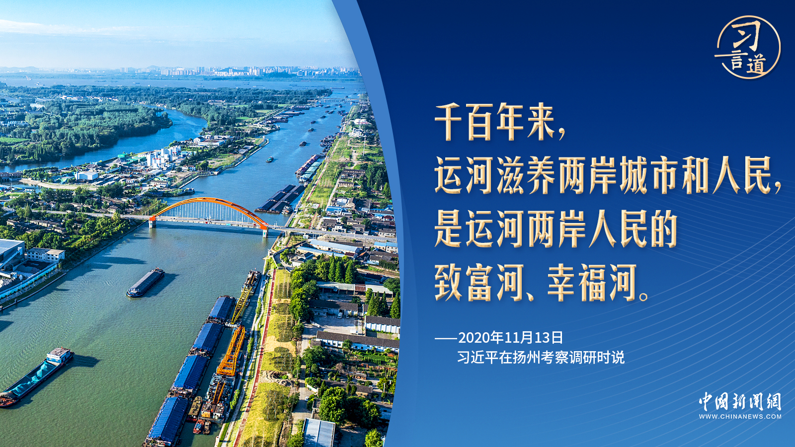 “千百年來(lái),運(yùn)河滋養(yǎng)兩岸城市和人民,是運(yùn)河兩岸人民的致富河、幸福河?!?020年考察揚(yáng)州運(yùn)河三灣生態(tài)文化公園時(shí),習(xí)近平一句“致富河、幸福河”指出了運(yùn)河保護(hù)的更深意涵。