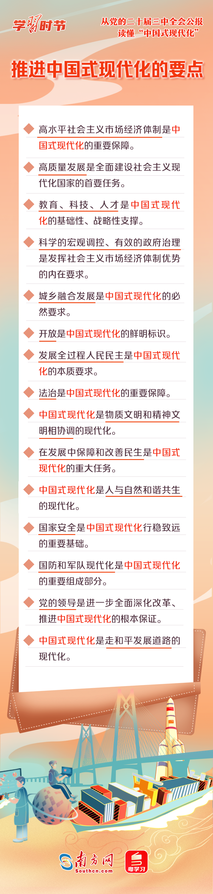 中國(guó)式現(xiàn)代化是中國(guó)共產(chǎn)黨和中國(guó)人民長(zhǎng)期實(shí)踐探索的成果,是一項(xiàng)偉大而艱巨的事業(yè)。全會(huì)公報(bào)中,“中國(guó)式現(xiàn)代化”一詞被反復(fù)提及,深刻闡述了進(jìn)一步全面深化改革與推進(jìn)中國(guó)式現(xiàn)代化的關(guān)系,以及中國(guó)式現(xiàn)代化的重要保障、必然要求、本質(zhì)要求等重要內(nèi)容。一起來(lái)學(xué)習(xí)!