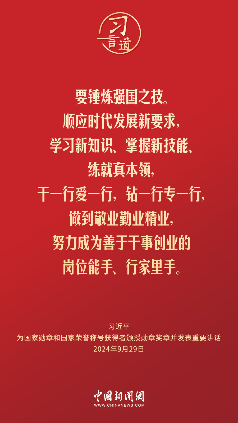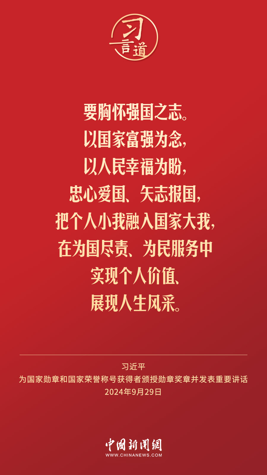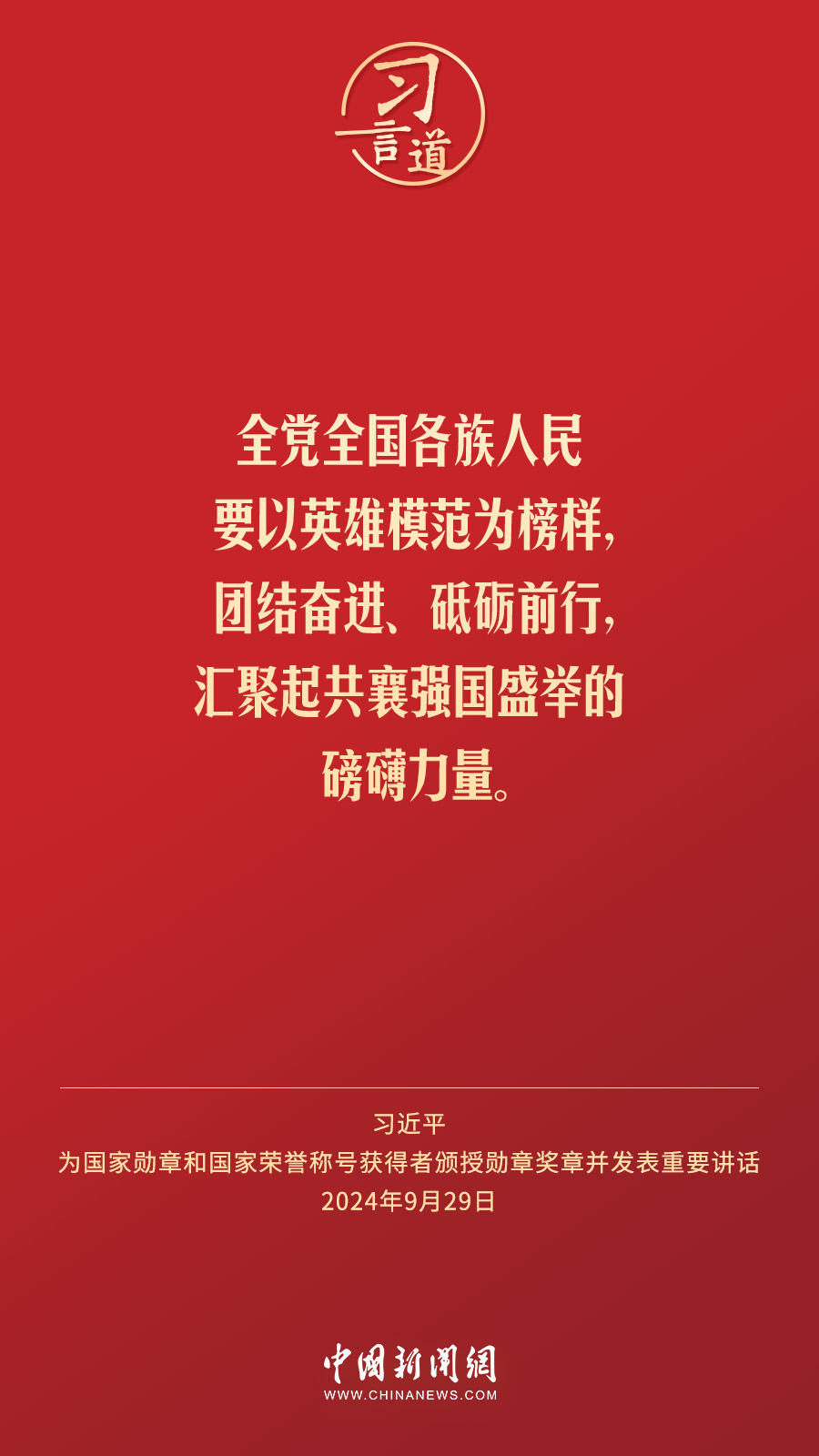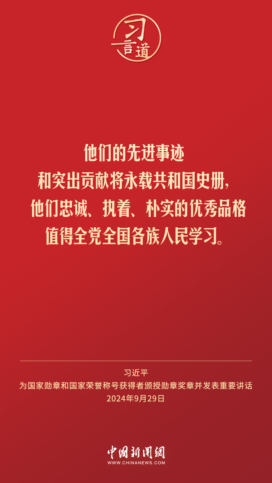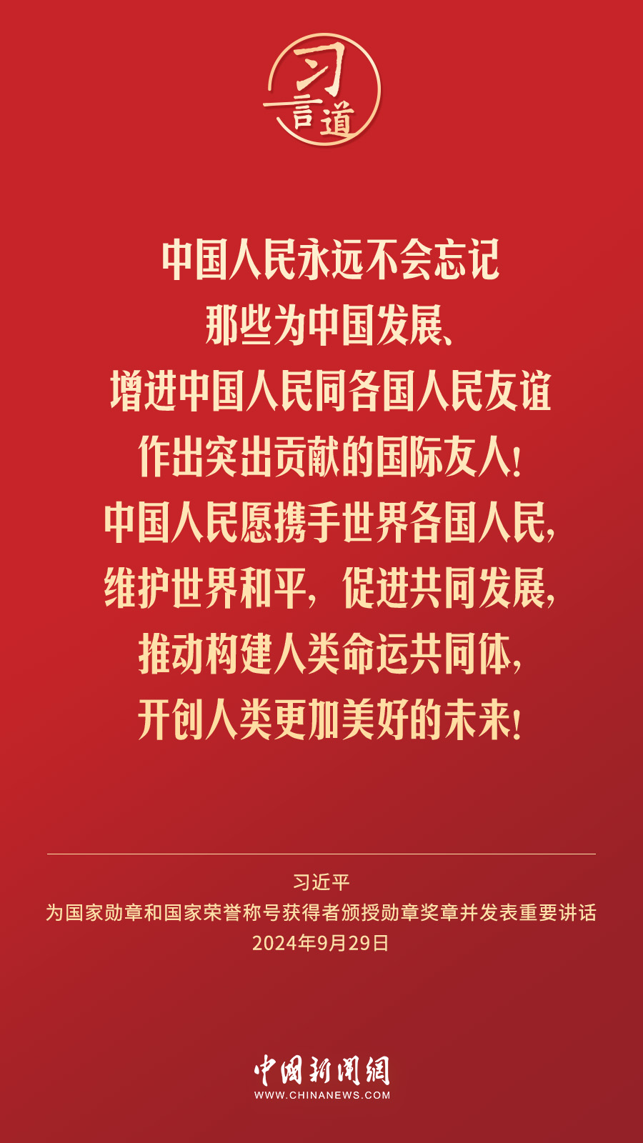 經(jīng)中共中央批準(zhǔn),中華人民共和國國家勛章和國家榮譽(yù)稱號(hào)頒授儀式于9月29日上午10時(shí)在人民大會(huì)堂隆重舉行。中共中央總書記、國家主席、中央軍委主席習(xí)近平向國家勛章和國家榮譽(yù)稱號(hào)獲得者分別授予“共和國勛章”“友誼勛章”和國家榮譽(yù)稱號(hào)獎(jiǎng)?wù)虏l(fā)表重要講話。習(xí)近平指出——