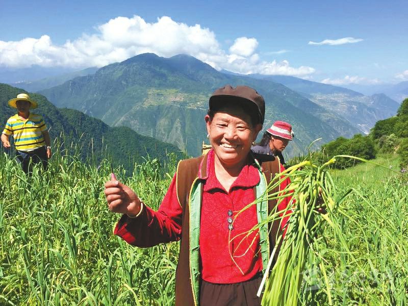 彭州市引入彭州蔬菜協(xié)會、彭州萱源農業(yè)有限公司在黑水縣雙溜索鄉(xiāng)俄瓜村建設100畝大蒜標準化種植基地。圖為貧困群眾采收蒜薹。