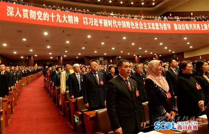 上午10時(shí)許,王東明宣布:四川省第十三屆人民代表大會第一次會議開幕。全體起立,雄壯的中華人民共和國國歌在會場內(nèi)唱響。