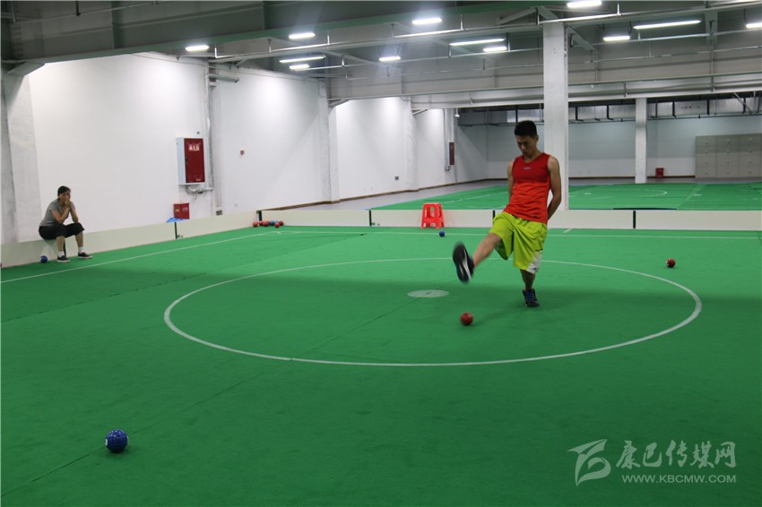 記者隨后被工作人員帶到了蹴球訓(xùn)練場(chǎng)地,只見(jiàn)在一個(gè)10米×10米的正方形平地上,一個(gè)運(yùn)動(dòng)員腳跟著地,用腳掌擠壓球,去擊中場(chǎng)內(nèi)球。