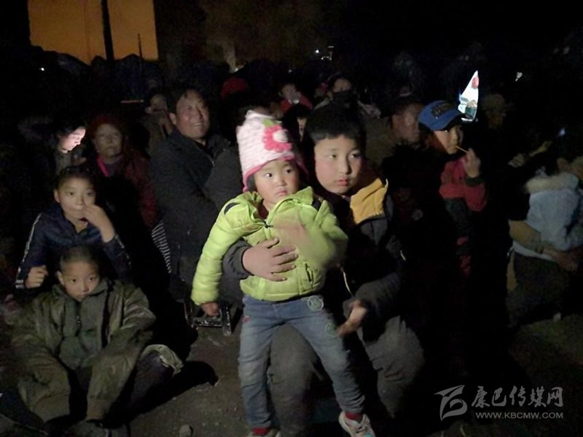 夜幕降臨,四川甘孜藏族自治州巴塘縣竹巴龍鄉(xiāng)納扎西村安置點的百姓聚在一起看電影。(圖片由巴塘縣宣傳部提供)