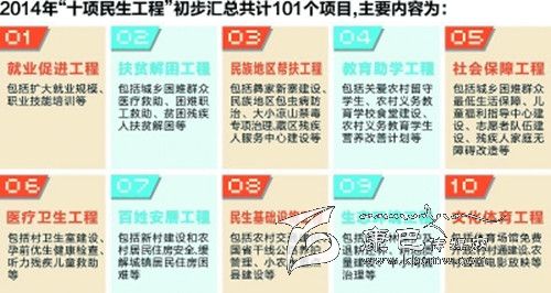 在征求各級(jí)部門、基層群眾意見的基礎(chǔ)上,今年“十項(xiàng)民生工程”已初步匯總101個(gè)項(xiàng)目,主要有:就業(yè)促進(jìn)工程,包括擴(kuò)大就業(yè)規(guī)模、職業(yè)技能培訓(xùn)等;扶貧解困工程,包括城鄉(xiāng)困難群眾醫(yī)療救助、困難職工救助等;民族地區(qū)幫扶工程,包括大小涼山禁毒專項(xiàng)治理、藏區(qū)殘疾人服務(wù)中心建設(shè)等;教育助學(xué)工程,包括農(nóng)村義務(wù)教育學(xué)校食堂建設(shè)等;社會(huì)保障工程,包括志愿者隊(duì)伍建設(shè)、殘疾人家庭無(wú)障礙改造等;醫(yī)療衛(wèi)生工程,包括孕前優(yōu)生健康檢查、聽力殘疾兒童救助等;百姓安居工程,包括農(nóng)村居民住房安全、緩解城鎮(zhèn)居民住房困難等;民生基礎(chǔ)設(shè)施工程,包括國(guó)省干線公路養(yǎng)護(hù)管理等;生態(tài)環(huán)境工程,包括耕地質(zhì)量建設(shè)、中小河流治理等;文化體育工程,包括體育場(chǎng)館免費(fèi)開放等。