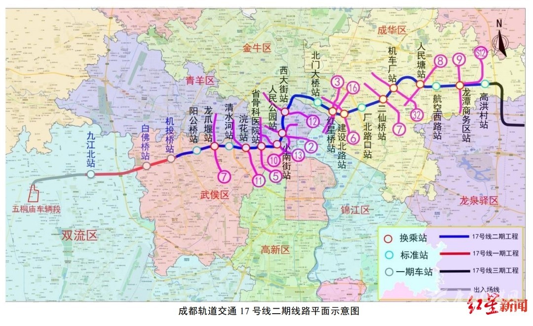 紅星新聞記者了解到,17號線一期工程已于2017年1月開工建設,計劃于2020年12月底建成投入試運營。本次環(huán)評公示的17號線二期工程位于成都市雙流區(qū)、武侯區(qū)、青羊區(qū)、金牛區(qū)和成華區(qū),工程起于一期工程機投橋站(不含),止于高洪片區(qū)的高洪村站(含),線路自西向東沿永康路-晉陽路-龍騰東路-大石西路-小南街-北較場西路-成華街-張家巷-建設北路-二仙橋北路-航天路敷設。線路長約24.8km,均為地下線路,共設置地下車站18座,其中有換乘站12座。