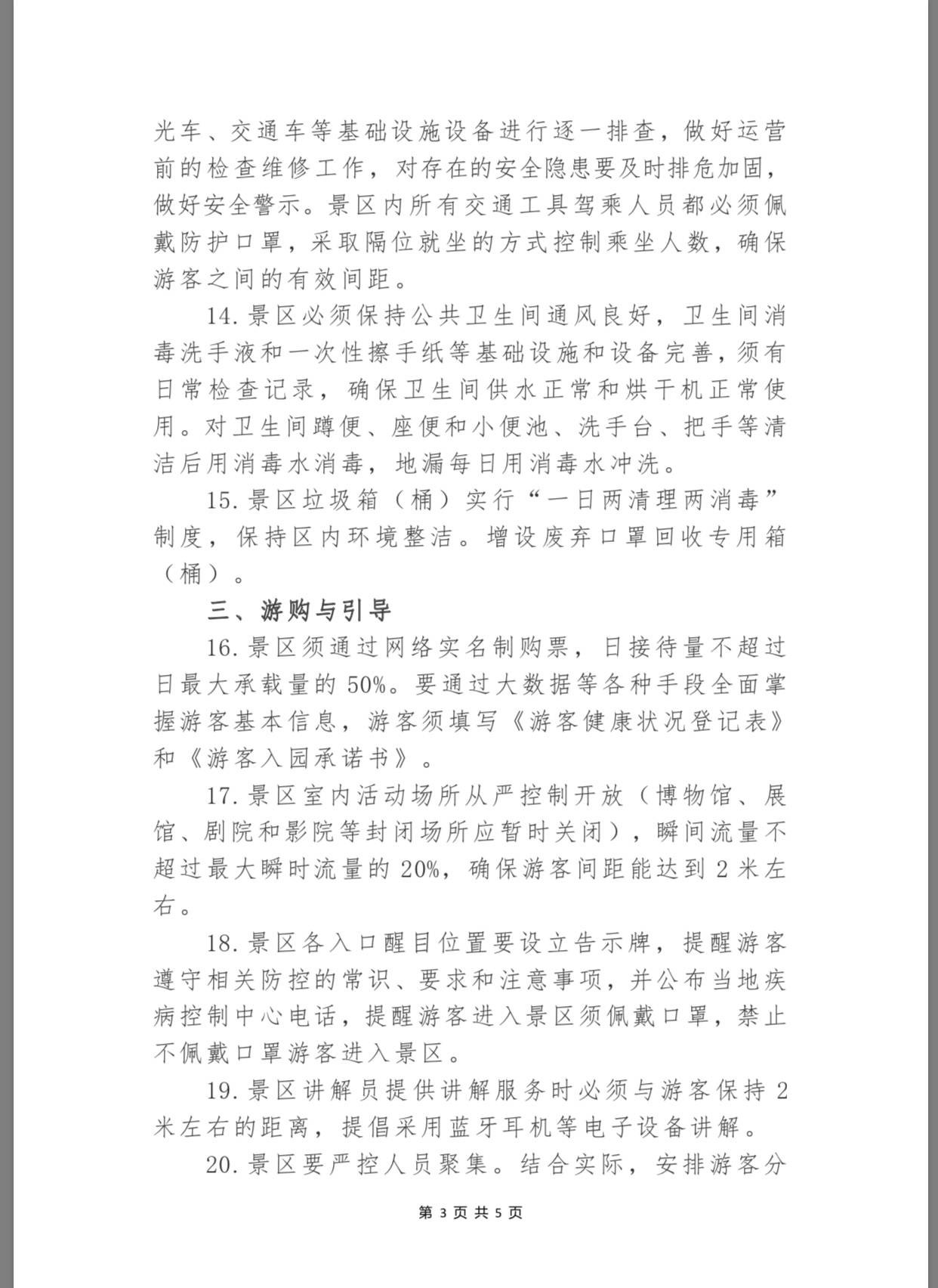 保障游客安全事無巨細(xì)?!吨改稀诽岢?,景區(qū)須通過網(wǎng)絡(luò)實(shí)名制購(gòu)票,日接待量不超過日最大承載量的50%。景區(qū)要通過大數(shù)據(jù)等各種手段全面掌握游客基本信息,游客須填寫《游客健康狀況登記表》和《游客入園承諾書》。景區(qū)室內(nèi)活動(dòng)場(chǎng)所從嚴(yán)控制開放(博物館、展館、劇院和影院等封閉場(chǎng)所應(yīng)暫時(shí)關(guān)閉),瞬間流量不超過最大瞬時(shí)流量的20%,確保游客間距能達(dá)到2米左右。此外,景區(qū)講解員提供講解服務(wù)時(shí)必須與游客保持2米左右的距離,提倡采用藍(lán)牙耳機(jī)等電子設(shè)備講解,并嚴(yán)控人員聚集,結(jié)合實(shí)際,安排游客分時(shí)段、間隔入園,實(shí)行分散式游覽。