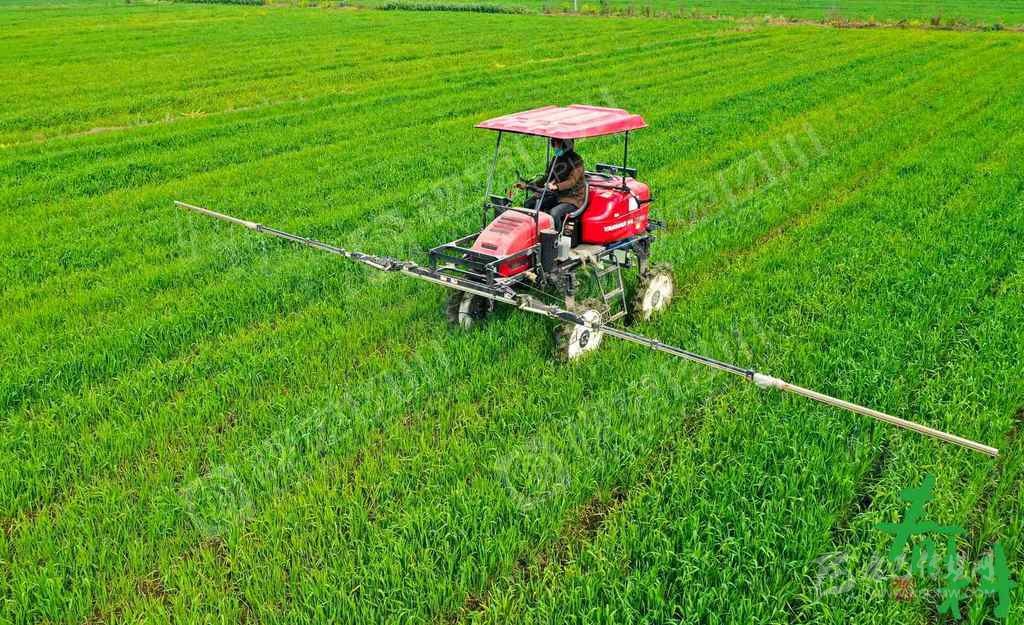 成都市青白江區(qū)彌牟鎮(zhèn)的智農(nóng)農(nóng)機(jī)專業(yè)合作社,工人正操作自走式噴桿噴霧機(jī)在麥田里打藥。