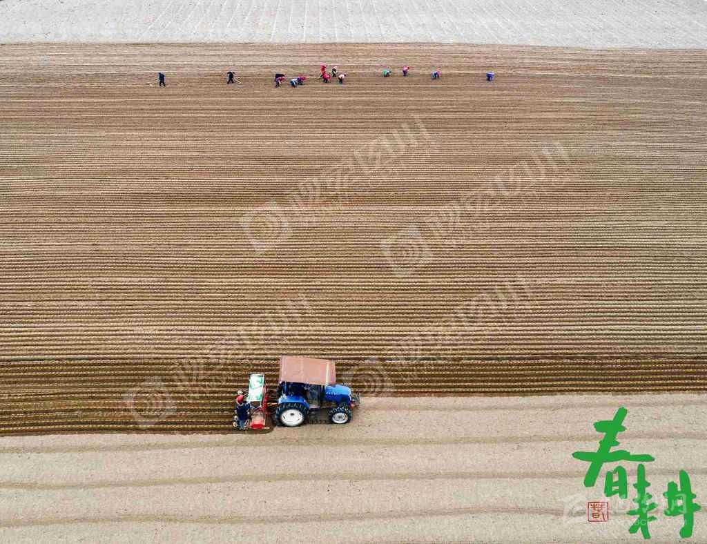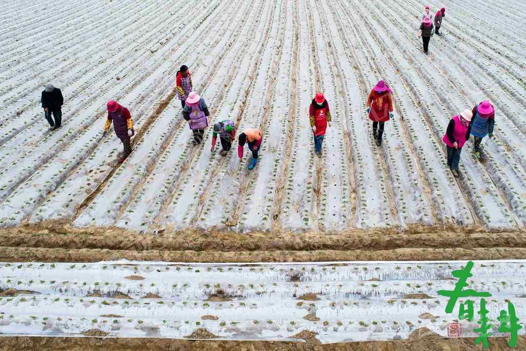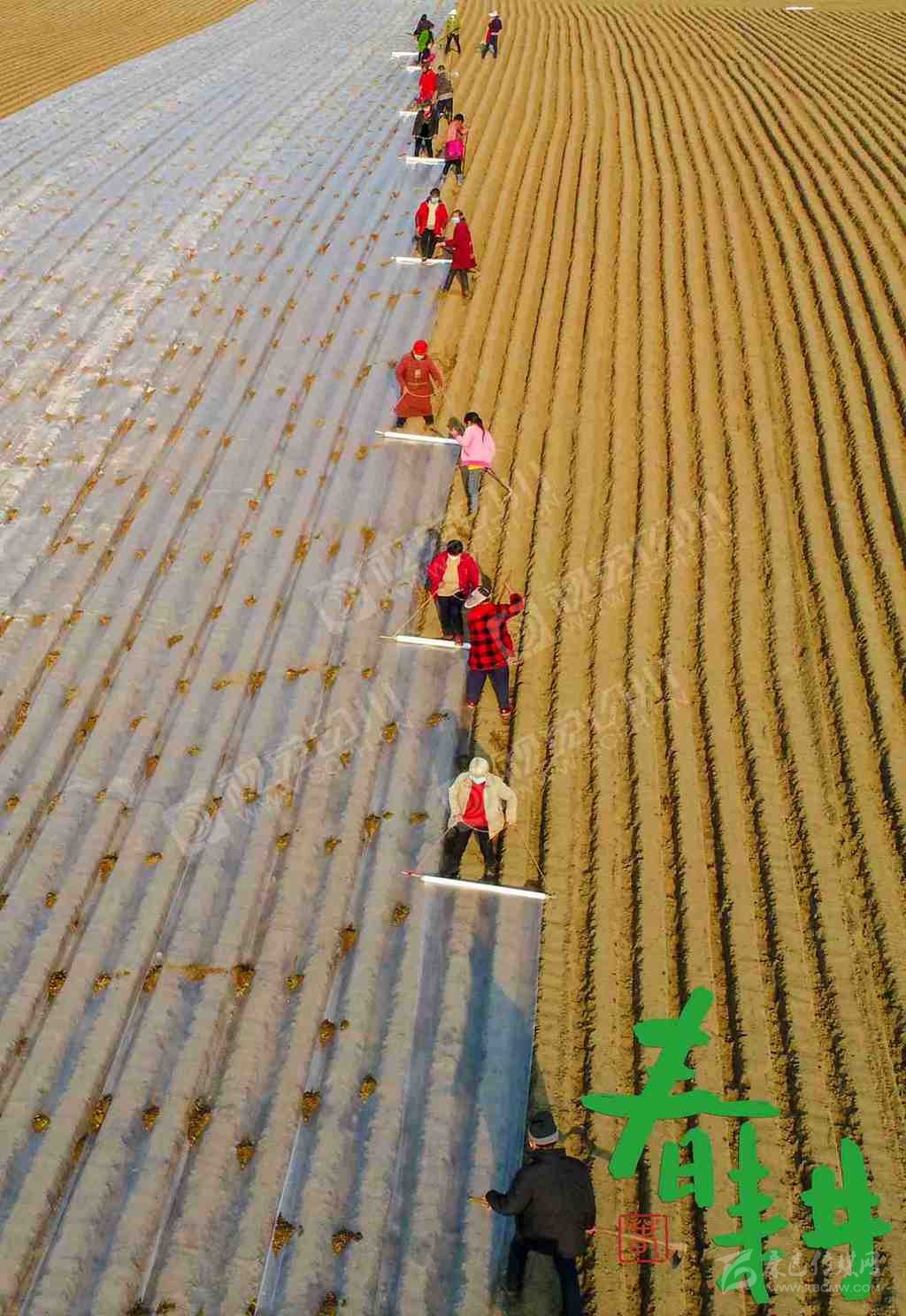 射洪市沱牌鎮(zhèn)桑樹林村,戴著口罩的農(nóng)戶正在地里播種、蓋膜。