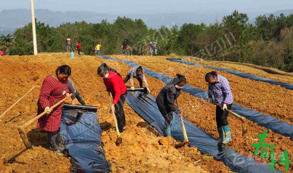 巴中市南江縣紅光鎮(zhèn)石寨村村民帶著口罩在開墾的荒坡地上開溝壘廂、覆蓋地膜,準(zhǔn)備栽植茶苗。