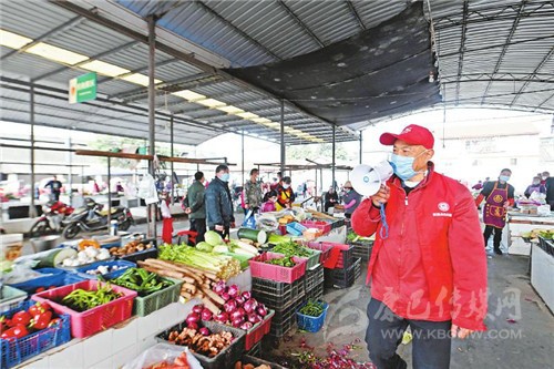 “喇叭哥”志愿服務(wù)很帶勁邱時(shí)春在農(nóng)貿(mào)市場用喇叭喊話,提醒大家戴好口罩。
