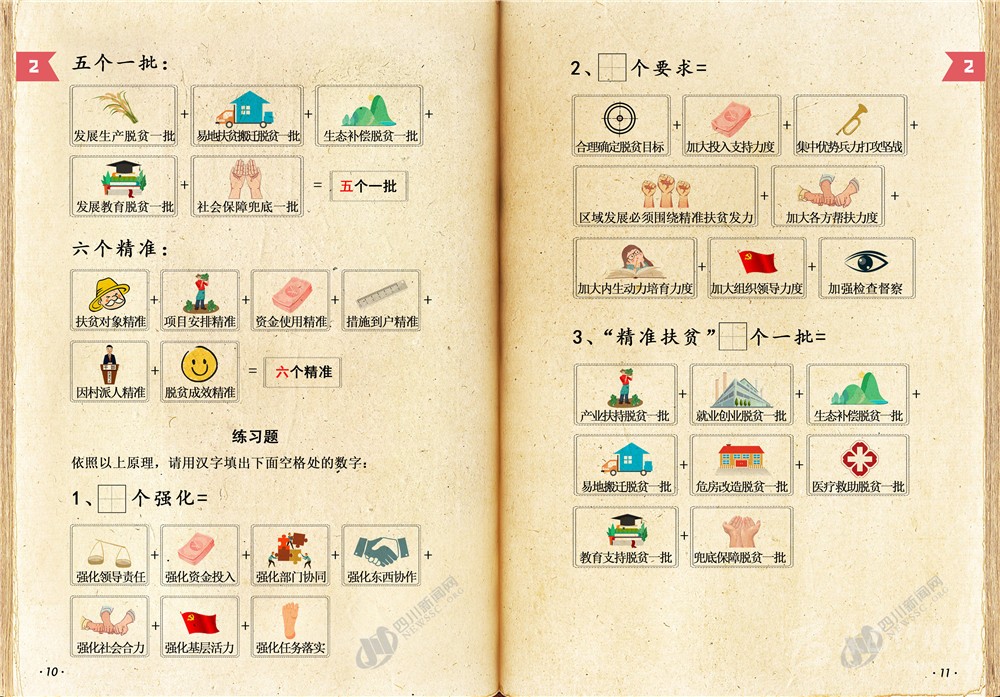 四川新聞網(wǎng)成都8月26日訊 又是周三啦?說好的脫貧攻堅小課堂如期而至!目前,打贏脫貧攻堅戰(zhàn)進(jìn)入最后沖刺的關(guān)鍵階段,四川還有很多硬仗要打,很多“硬骨頭”要啃,防止返貧致貧任務(wù)繁重,脫貧攻堅工作力度還需要加強(qiáng),面臨的困難和挑戰(zhàn)依然十分艱巨。為了深入推進(jìn)精準(zhǔn)扶貧精準(zhǔn)脫貧,奪取全省脫貧攻堅收官之戰(zhàn)全面勝利,本課采用上一課剛剛學(xué)到的數(shù)字來總結(jié)歸納了脫貧攻堅政策和方法的關(guān)鍵知識點,以便讓廣大同學(xué)進(jìn)一步掌握這些政策、運用這些方法,提高政策受益覆蓋面及知曉率,確保各項政策落到實處。