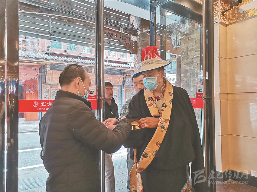 色達(dá)縣演出隊(duì)入住邦金麥朵酒店。每天,酒店安保人員多扎準(zhǔn)時(shí)出現(xiàn)在門口,提醒演職人員測(cè)量體溫、佩戴口罩。“我是酒店的第一關(guān)卡,拉姆是第二關(guān),我倆相互配合,表演節(jié)目的客人住得放心,演出的節(jié)目才會(huì)更加精彩?!蹦弥w溫槍,多扎一臉自豪地說。