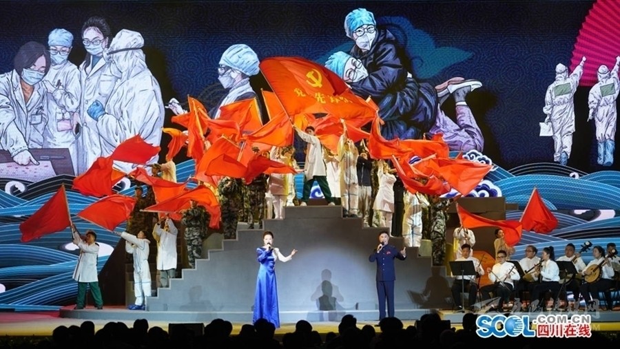 19時30分許,在催人奮進(jìn)的陣陣鼓聲中,開幕式正式開始。胡和平在致辭中表示,第六屆中國詩歌節(jié)在四川省和重慶市兩地一同舉辦,是落實(shí)黨中央推動成渝地區(qū)雙城經(jīng)濟(jì)圈建設(shè)決策部署的務(wù)實(shí)之舉,也是以文化繁榮為經(jīng)濟(jì)社會高質(zhì)量發(fā)展賦能助力的務(wù)實(shí)之舉。剛剛閉幕的十九屆五中全會把文化建設(shè)放在突出位置,明確“十四五”時期文化建設(shè)目標(biāo)要求,提出到2035年建成文化強(qiáng)國的遠(yuǎn)景目標(biāo)。廣大文藝工作者要以習(xí)近平總書記關(guān)于文藝工作的重要論述精神為遵循,貫徹落實(shí)黨中央關(guān)于文化工作的各項(xiàng)決策部署,堅(jiān)持以人民為中心的創(chuàng)作導(dǎo)向,堅(jiān)持與時代同步伐,發(fā)時代之先聲、頌時代之精神,用心用情用功抒寫偉大時代,推出更多謳歌黨、謳歌祖國、謳歌人民、謳歌英雄的精品力作,推動社會主義文化繁榮興盛,為實(shí)現(xiàn)中華民族偉大復(fù)興中國夢凝聚文化力量。