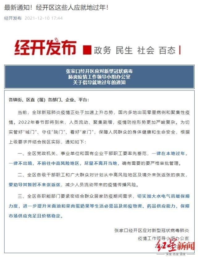 12月9日,河北張家口經(jīng)開區(qū)也發(fā)出通知:全區(qū)黨政機(jī)關(guān)職工等就地過年。通知中倡導(dǎo):全區(qū)黨政機(jī)關(guān)、事業(yè)單位和國有企業(yè)干部職工要率先垂范,一律在本地過年,一律不出境,不前往中高風(fēng)險地區(qū),盡量不離開當(dāng)?shù)?,確有需要的要嚴(yán)格審批管理。