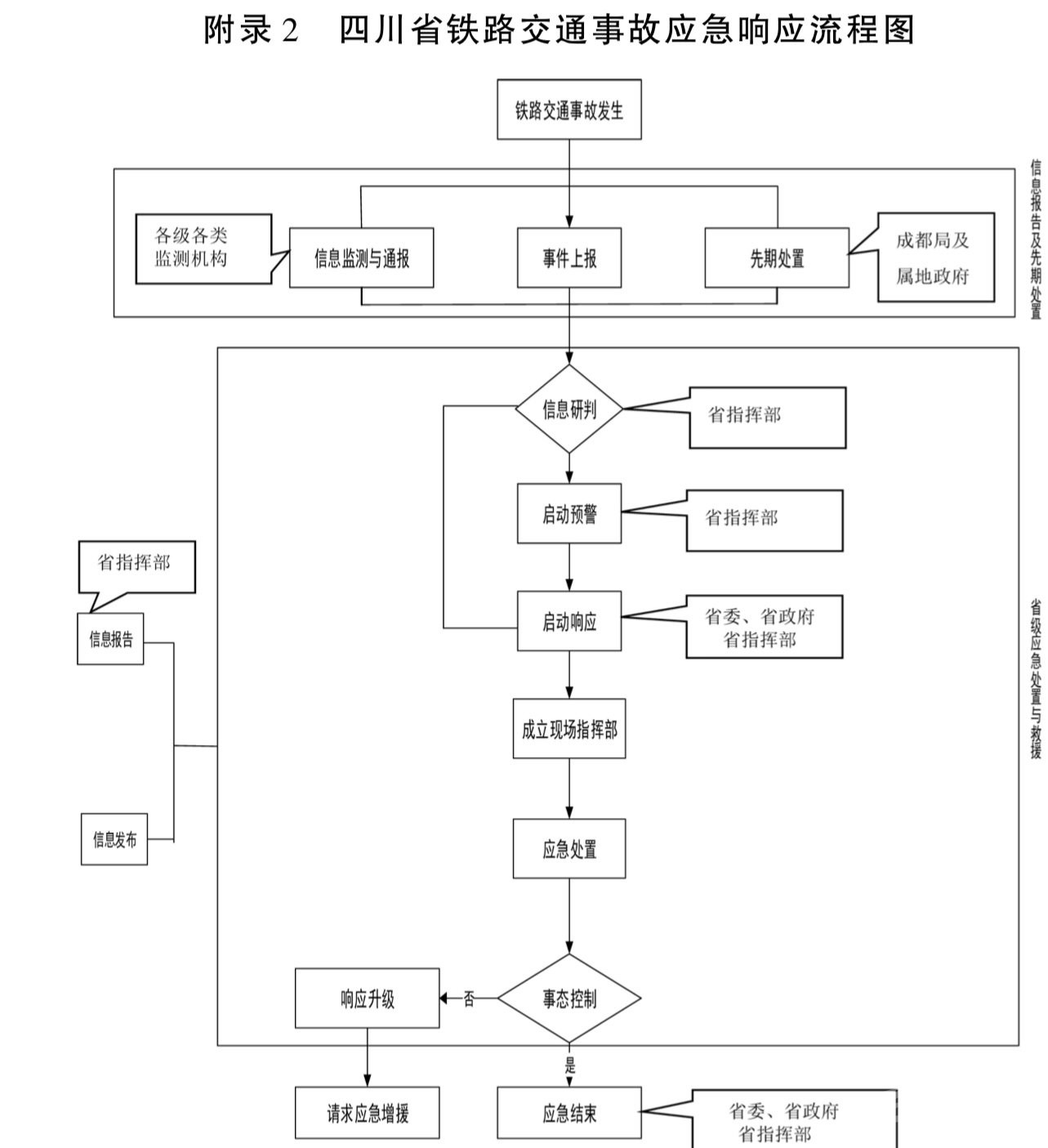 當出現(xiàn)重大鐵路交通事故時,實行分級應對。初判發(fā)生特別重大、重大事故,由省級層面負責應對;初判發(fā)生較大、一般事故,分別由事發(fā)地市(州)和縣(市、區(qū))層面負責應對,或按照上級組織指揮機構(gòu)要求具體組織調(diào)度。