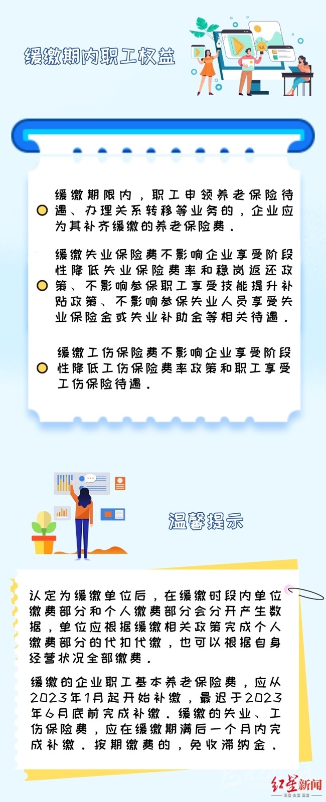 緩繳期限內(nèi),職工申領(lǐng)養(yǎng)老保險(xiǎn)待遇、辦理關(guān)系轉(zhuǎn)移等業(yè)務(wù)的,企業(yè)應(yīng)為其補(bǔ)齊緩繳的養(yǎng)老保險(xiǎn)費(fèi)。緩繳失業(yè)保險(xiǎn)費(fèi)不影響企業(yè)享受階段性降低失業(yè)保險(xiǎn)費(fèi)率和穩(wěn)崗返還政策、不影響參保職工享受技能提升補(bǔ)貼政策、不影響參保失業(yè)人員享受失業(yè)保險(xiǎn)金或失業(yè)補(bǔ)助金等相關(guān)待遇。緩繳工傷保險(xiǎn)費(fèi)不影響企業(yè)享受階段性降低工傷保險(xiǎn)費(fèi)率政策和職工享受工傷保險(xiǎn)待遇,要切實(shí)維護(hù)好職工權(quán)益。