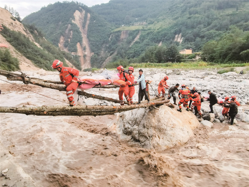 道路中斷、信號中斷,河流上漲、橋梁垮塌?!皼]有橋,我們的雙手就是橋。”關鍵時刻,四川省森林消防總隊甘孜支隊消防員兵分兩路實施營救。一路“繩為引、步為尺”先期過河救治傷員,一路就地取材急流上用樹干搭起“生命通道”,自制擔架將傷員一一運送過河;截至5日晚23時40分,甘孜森林消防隊員們翻山越嶺往返近7小時,安全轉(zhuǎn)運重傷員24人、近200名群眾,徒步行程18公里。