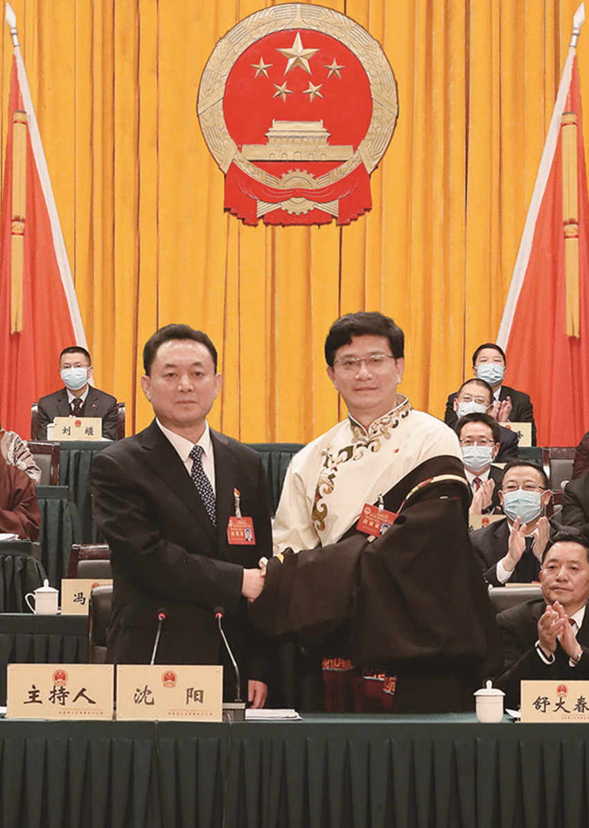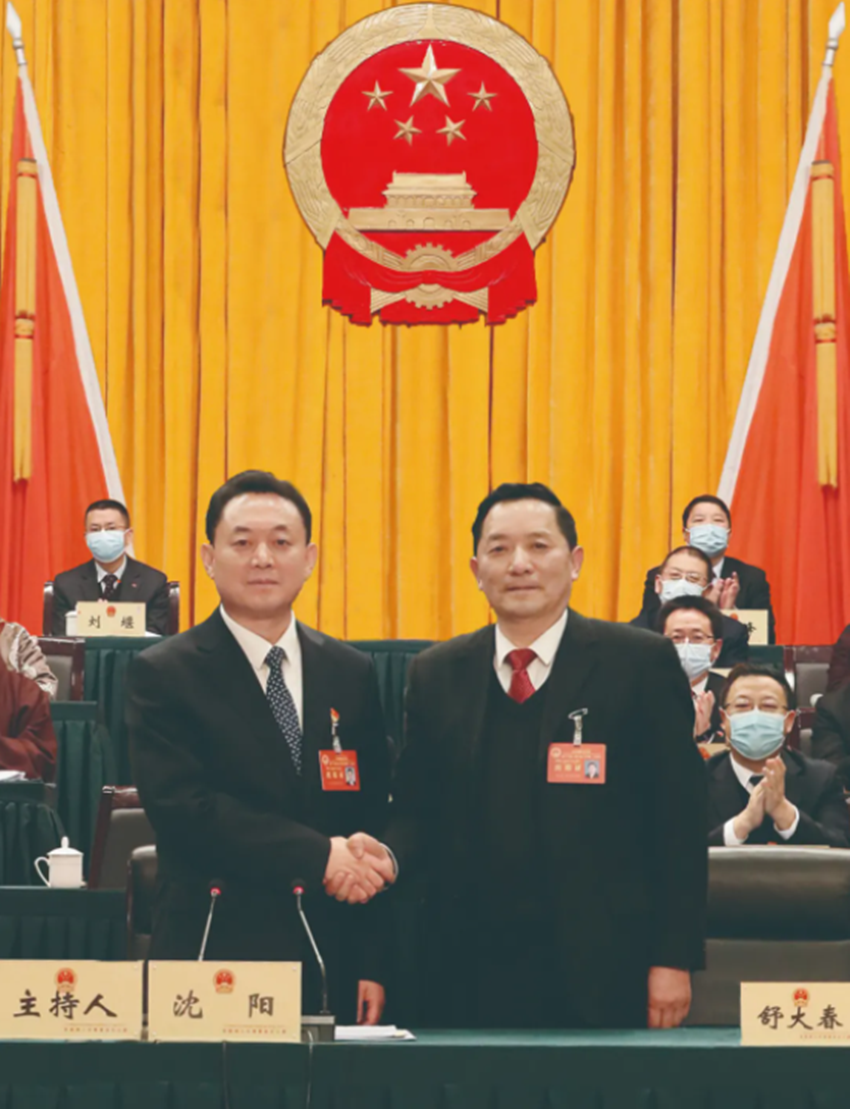 州十三屆人大一次會(huì)議上,州委書記沈陽向當(dāng)選的州人大常委會(huì)主任舒大春表示祝賀。