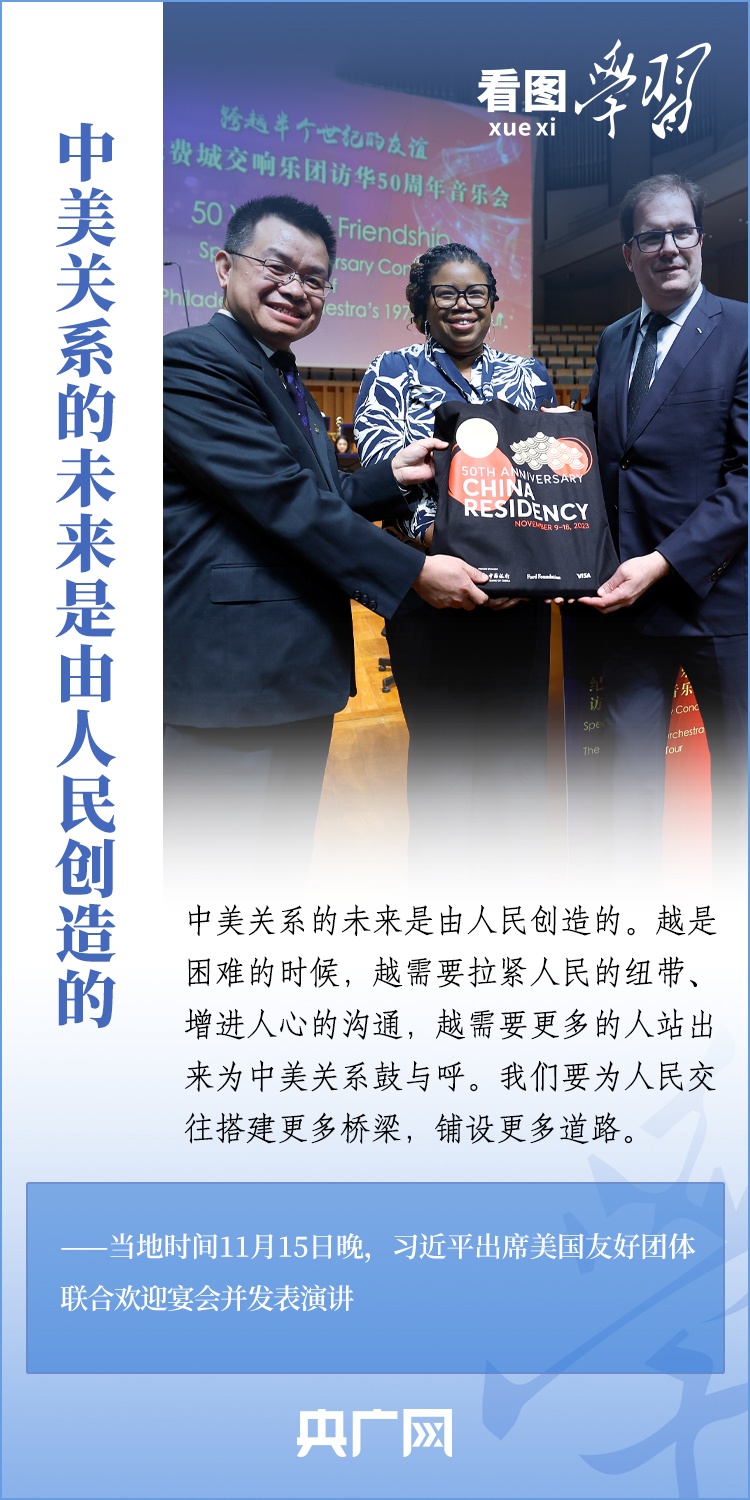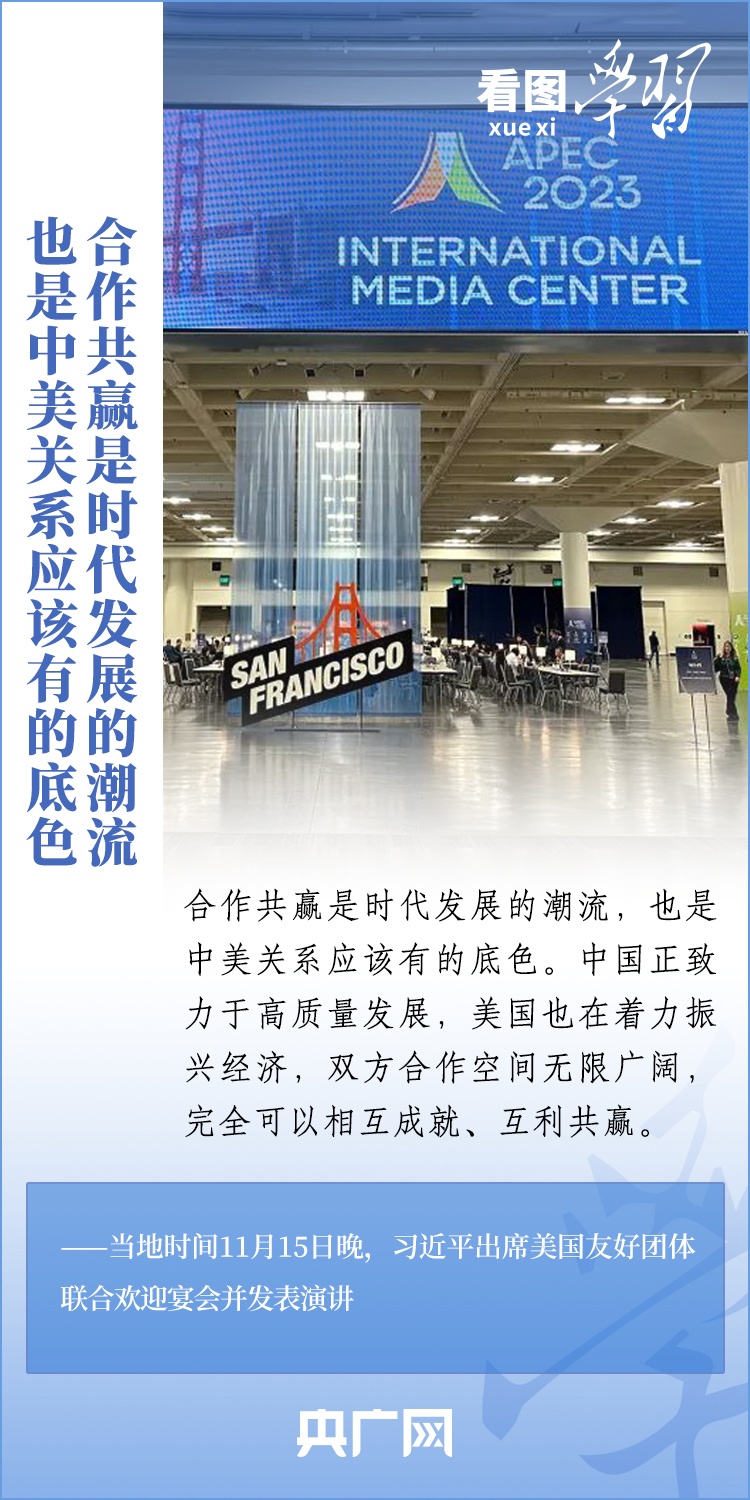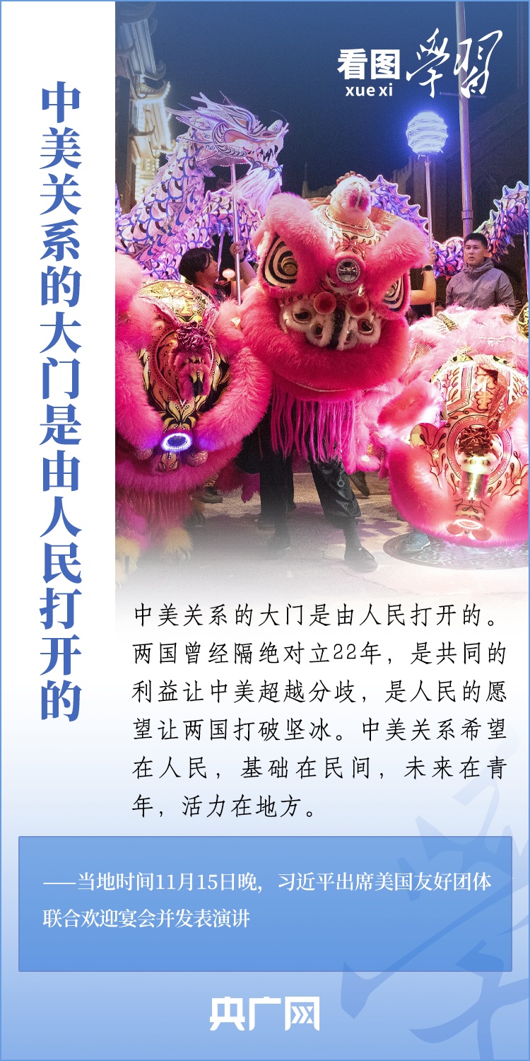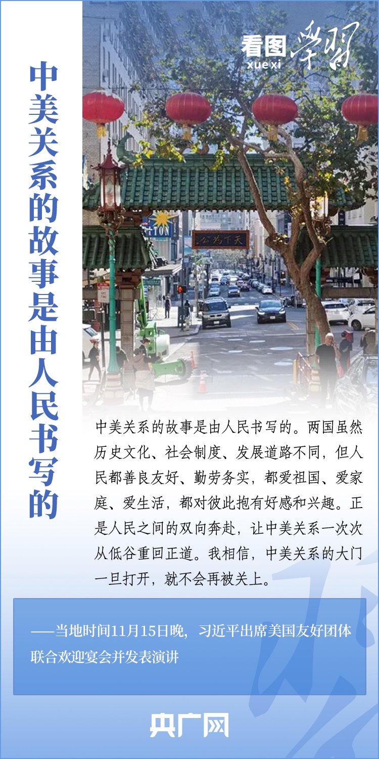 當(dāng)?shù)貢r(shí)間11月15日晚,國(guó)家主席習(xí)近平在美國(guó)舊金山出席美國(guó)友好團(tuán)體聯(lián)合舉行的歡迎宴會(huì)并發(fā)表重要演講。習(xí)近平主席在演講中系統(tǒng)闡述了關(guān)于中美關(guān)系的一系列觀點(diǎn)、立場(chǎng)、原則,強(qiáng)調(diào)“中美關(guān)系希望在人民,基礎(chǔ)在民間,未來(lái)在青年,活力在地方”,希望匯聚起兩國(guó)人民的力量,賡續(xù)中美友誼,推進(jìn)中美關(guān)系,努力為促進(jìn)世界和平和發(fā)展作出更大貢獻(xiàn)!一起來(lái)學(xué)習(xí)。