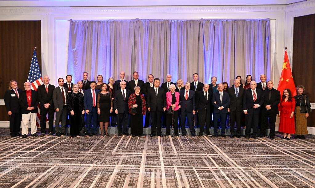 當(dāng)?shù)貢r(shí)間11月15日晚,國(guó)家主席習(xí)近平在美國(guó)舊金山出席美國(guó)友好團(tuán)體聯(lián)合舉行的歡迎宴會(huì)。這是宴會(huì)開(kāi)始前,習(xí)近平會(huì)見(jiàn)飛虎隊(duì)和史迪威將軍后人、鼓嶺、艾奧瓦州、華盛頓州等方面友好人士代表,同他們親切交談并合影留念。