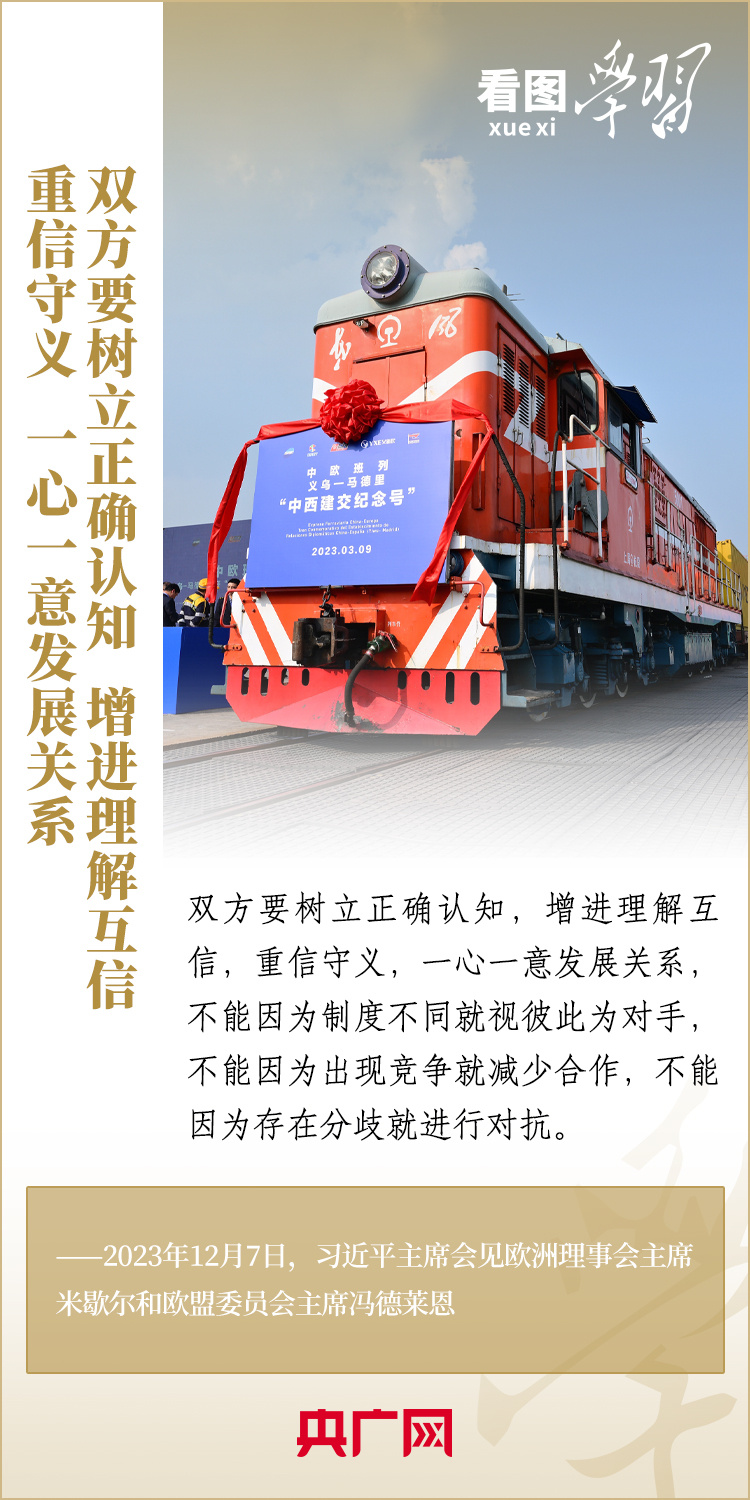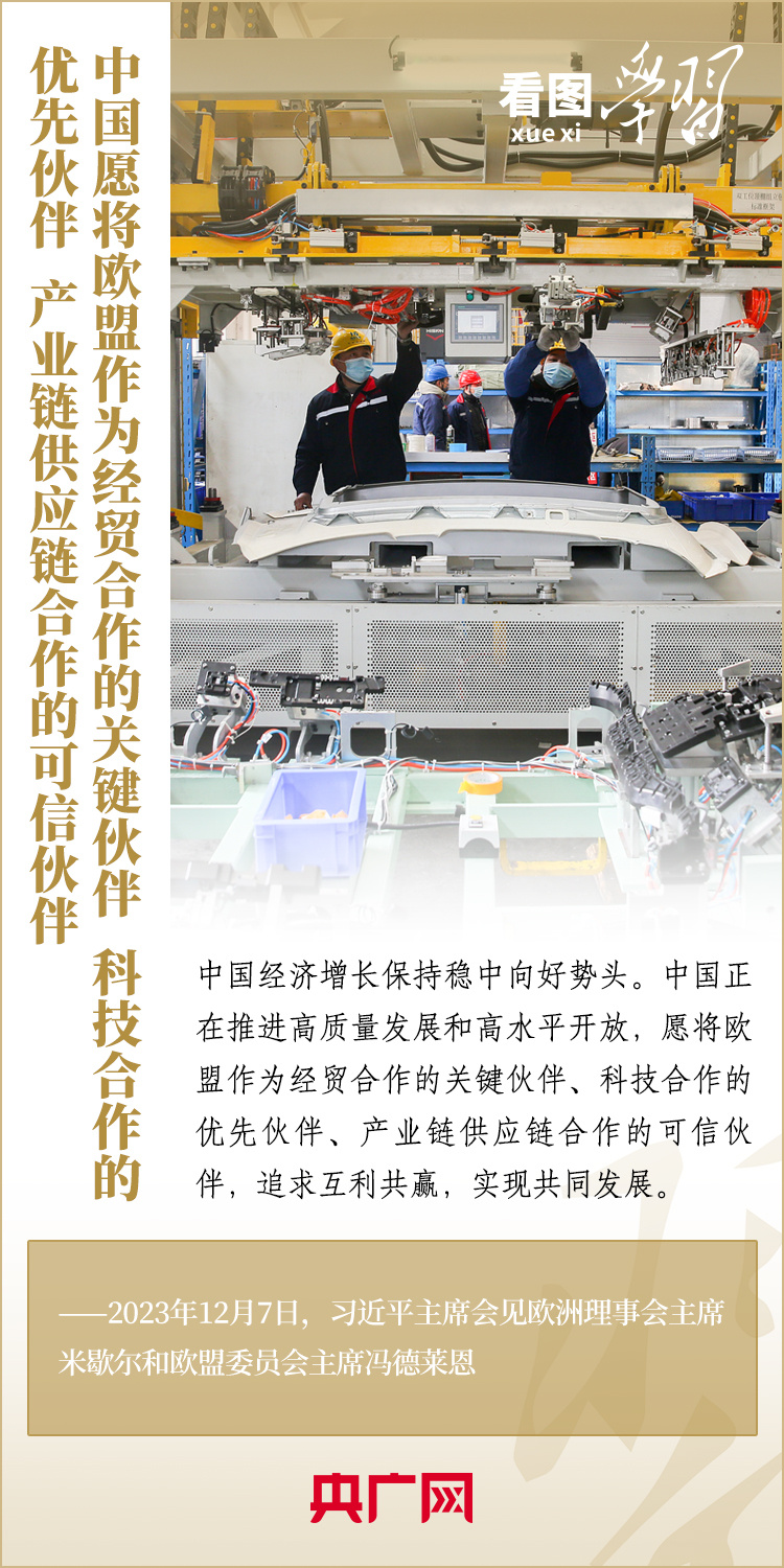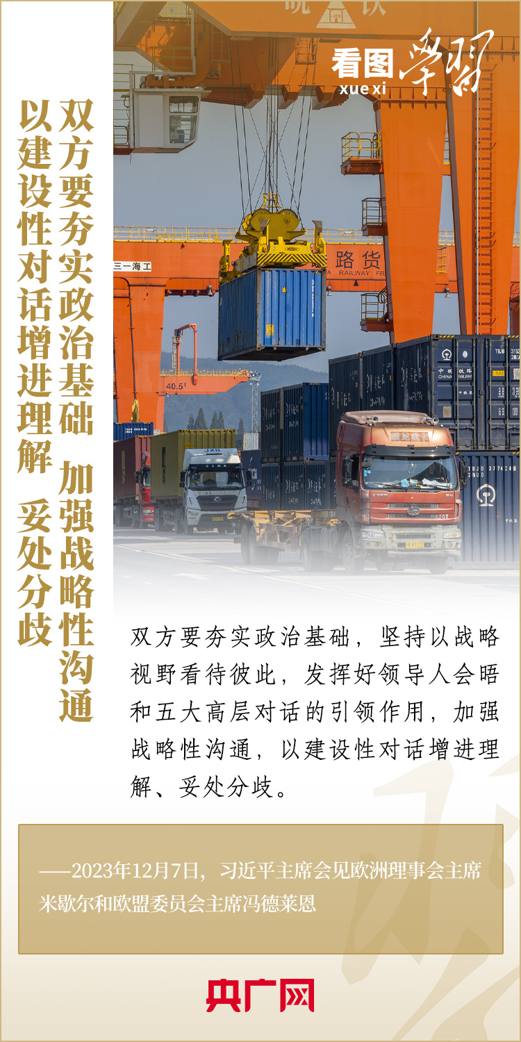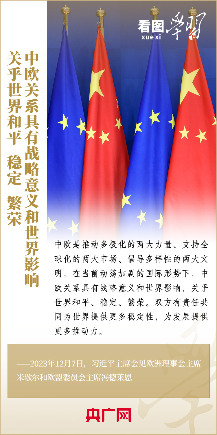 12月7日,國家主席習(xí)近平會見來華舉行第二十四次中國—?dú)W盟領(lǐng)導(dǎo)人會晤的歐洲理事會主席米歇爾和歐盟委員會主席馮德萊恩,雙方就事關(guān)中歐關(guān)系的戰(zhàn)略性問題,以及中歐各領(lǐng)域?qū)υ捄献?、雙方重點(diǎn)關(guān)切、全球治理、國際和地區(qū)熱點(diǎn)問題等深入坦誠交換看法,并就一系列問題達(dá)成重要共識。今年是中歐建立全面戰(zhàn)略伙伴關(guān)系20周年,習(xí)主席強(qiáng)調(diào),中歐關(guān)系具有戰(zhàn)略意義和世界影響,關(guān)乎世界和平、穩(wěn)定、繁榮。一起來學(xué)習(xí)!