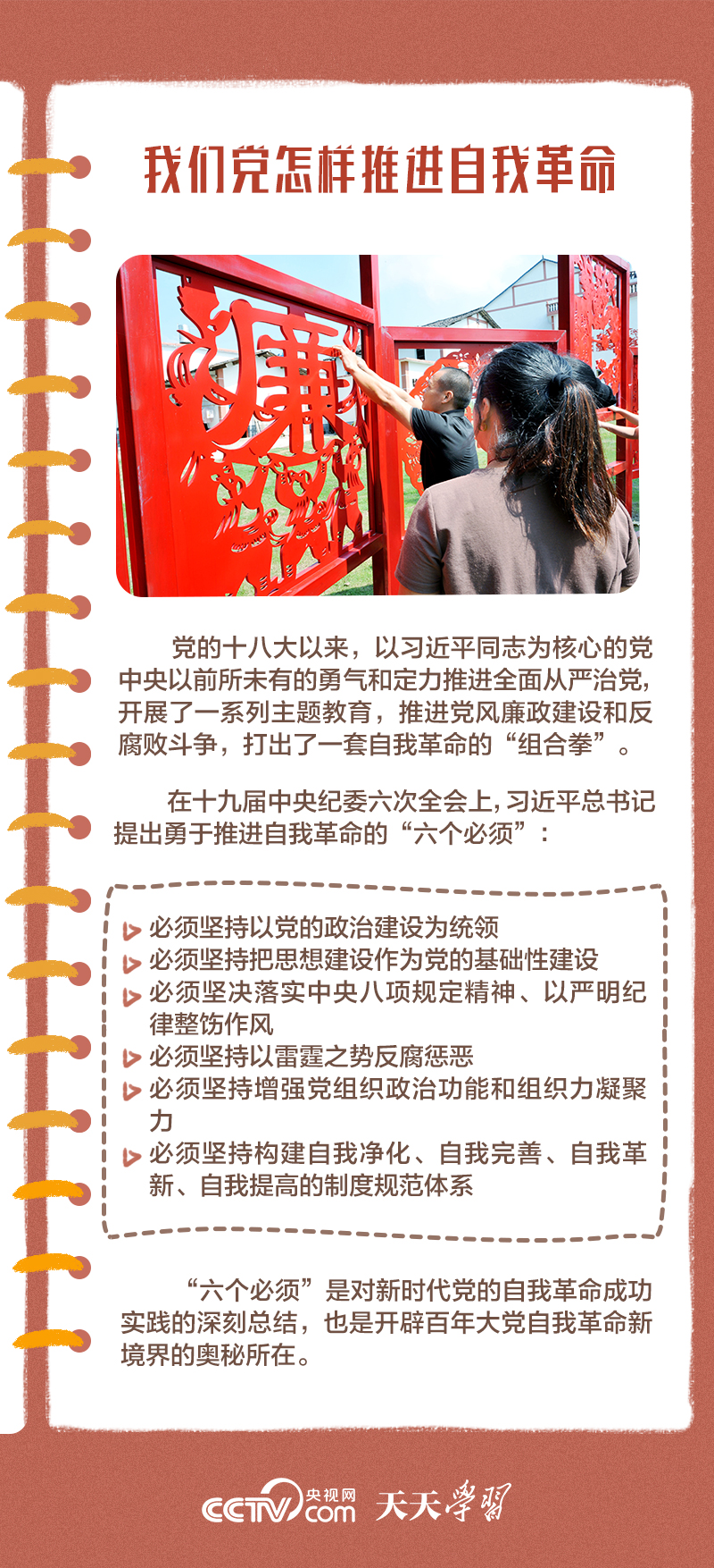 勇于自我革命是我們黨最鮮明的品格和最大的優(yōu)勢,總書記多次對推進(jìn)黨的自我革命作出重要部署。此次會議上,總書記深刻闡述了黨的自我革命的重要思想,明確提出需要把握好九個(gè)問題,并對持續(xù)發(fā)力、縱深推進(jìn)反腐敗斗爭作出戰(zhàn)略部署。央視網(wǎng)《天天學(xué)習(xí)》與您一起學(xué)習(xí)。