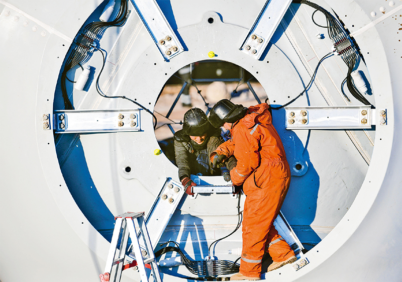 河北承德豐寧風光氫儲100萬千瓦風光項目是國家“十四五”規(guī)劃的大型清潔能源基地——冀北清潔能源基地的標志性工程。項目建成后,預計每年可生產綠電18億千瓦時,減少二氧化碳排放約140萬噸。圖為2024年1月12日,該項目的工人在安裝風機輪轂配件。 新華社發(fā) 王立群/攝