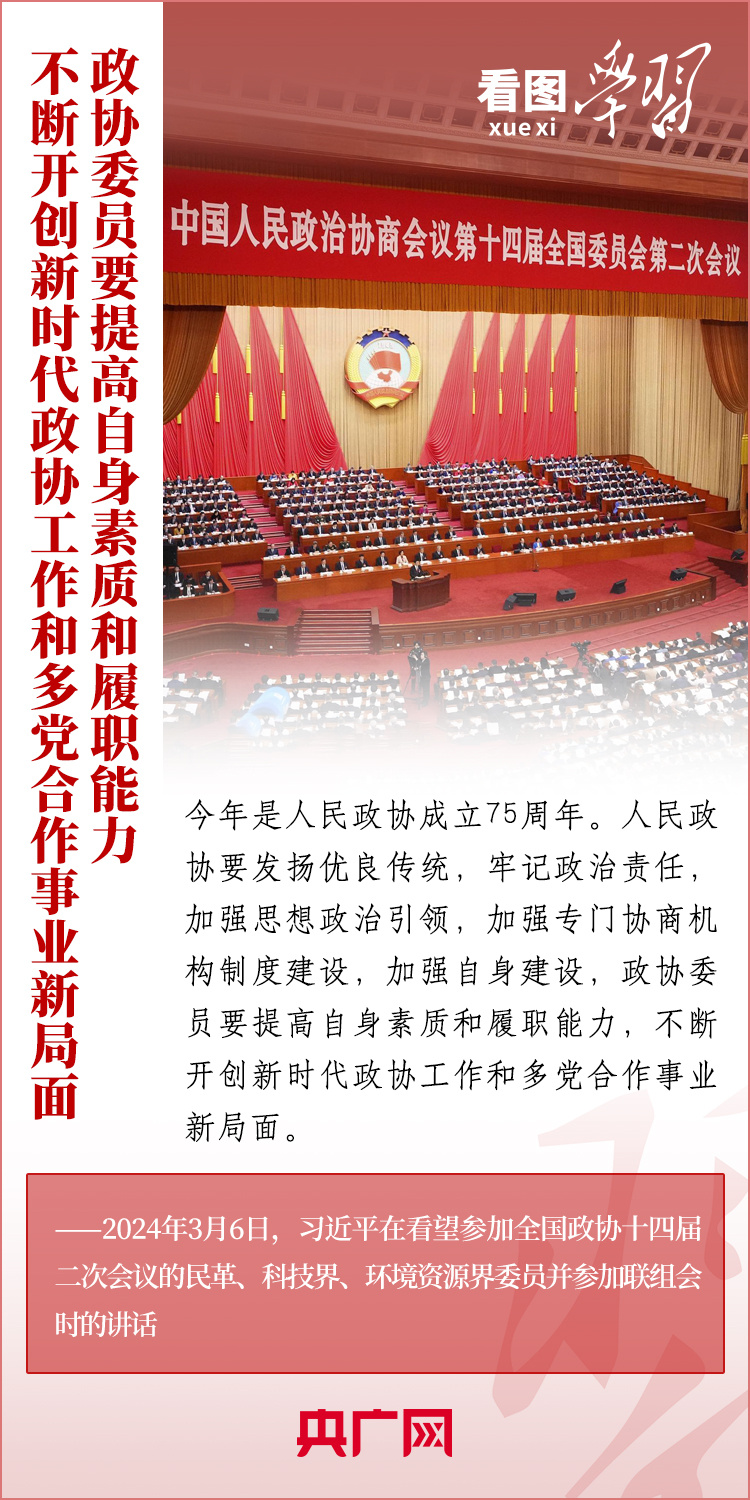 今年是人民政協(xié)成立75周年。3月6日下午,習近平總書記在看望參加全國政協(xié)十四屆二次會議的民革、科技界、環(huán)境資源界委員并參加聯(lián)組會時強調(diào),人民政協(xié)各黨派、各團體、各族各界各方面人士要圍繞中共二十大提出的重大戰(zhàn)略任務和中央經(jīng)濟工作會議部署,深入調(diào)查研究,積極建言資政,廣泛凝聚共識,助力中國式現(xiàn)代化建設(shè)。一起來學習!