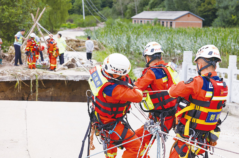 2023年夏,面對(duì)影響華北、黃淮、東北等地的嚴(yán)重汛情,在以習(xí)近平同志為核心的黨中央堅(jiān)強(qiáng)領(lǐng)導(dǎo)下,廣大黨員干部為守護(hù)人民生命和財(cái)產(chǎn)安全挺身向前,千千萬(wàn)萬(wàn)人民群眾為保衛(wèi)家園頑強(qiáng)奮戰(zhàn)。圖為8月6日,吉林省吉林市消防救援支隊(duì)隊(duì)員利用繩橋解救受困村民。 新華社記者 顏麟蘊(yùn)/攝