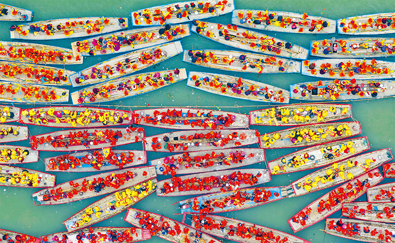 溱潼會船由南宋相沿至今,歷經數百年傳承,被列入國家級非物質文化遺產名錄。圖為2024年4月6日在江蘇省泰州市姜堰區(qū)溱湖國家濕地公園參加會船表演的船只。 新華社發(fā) 湯德宏/攝