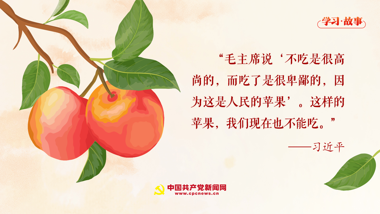 “毛主席說(shuō)‘不吃是很高尚的,而吃了是很卑鄙的,因?yàn)檫@是人民的蘋果’。這樣的蘋果,我們現(xiàn)在也不能吃?!绷?xí)近平總書記意味深長(zhǎng)地說(shuō)。