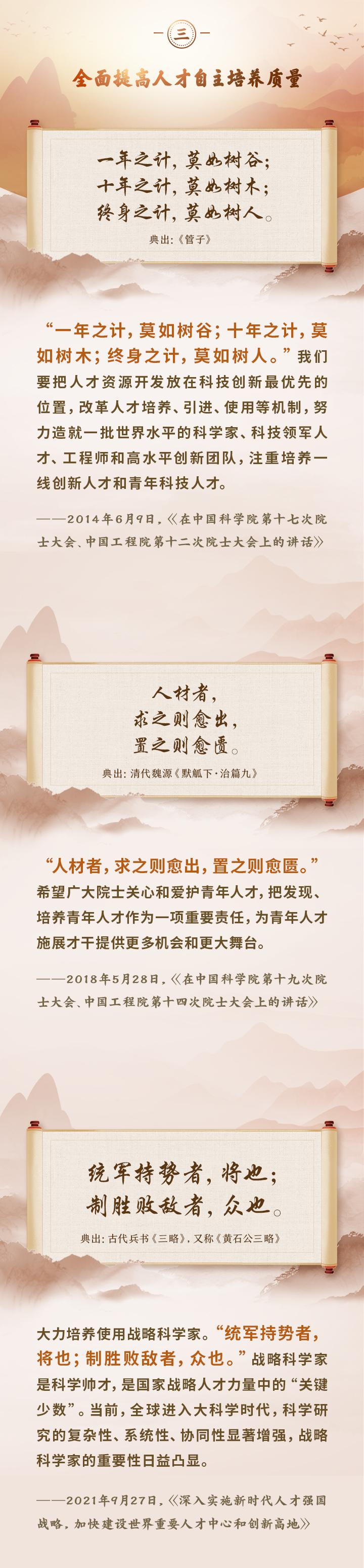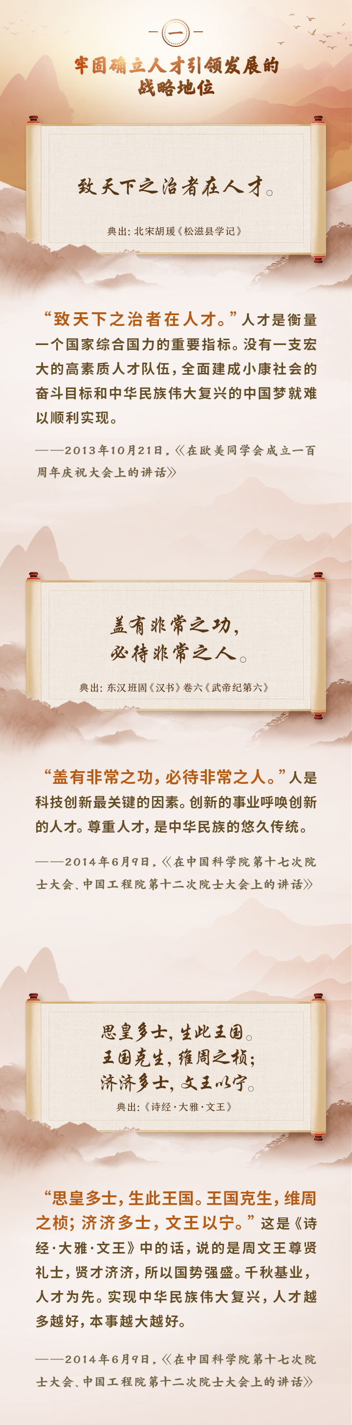 編者按:培養(yǎng)造就大批德才兼?zhèn)涞母咚刭|(zhì)人才,是國家和民族長遠(yuǎn)發(fā)展大計。黨的十八大以來,習(xí)近平總書記圍繞人才工作發(fā)表一系列重要論述,立意高遠(yuǎn),內(nèi)涵豐富,思想深刻,深刻回答了為什么建設(shè)人才強(qiáng)國、什么是人才強(qiáng)國、怎樣建設(shè)人才強(qiáng)國的重大理論和實踐問題。在這些重要論述中,總書記精妙運(yùn)用古代典籍、經(jīng)典名句,以古喻今、啟迪思想、激蕩精神,讓我們一起來學(xué)習(xí)!