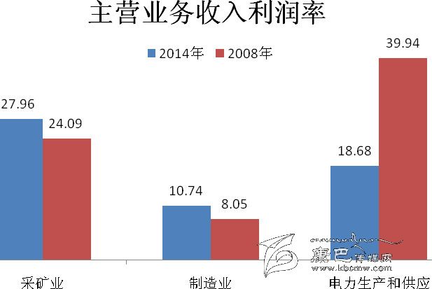 2013年,規(guī)模以上工業(yè)企業(yè)法人單位總資產(chǎn)貢獻(xiàn)率為8.46%,比2008年下降4.56個百分點。主營業(yè)務(wù)收入利潤率為18.83%,比2008年下降11.12個百分點。其中,采礦業(yè)為27.96%,比2008年上升3.87個百分點;制造業(yè)為10.74%,比2008年上升2.69個百分點;電力、熱力、燃?xì)饧八a(chǎn)和供應(yīng)業(yè)為18.68%,比2008年下降21.26 個百分點(詳見表2-4)。